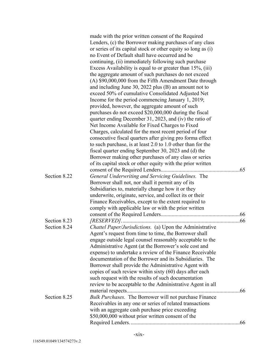 -xix- 116549.01049/134574273v.2 made with the prior written consent of the Required Lenders, (c) the Borrower making purchases of any class or series of its capital stock or other equity so long as (i) no Event of Default shall have occurred and be continuing, (ii) immediately following such purchase Excess Availability is equal to or greater than 15%, (iii) the aggregate amount of such purchases do not exceed (A) $90,000,000 from the Fifth Amendment Date through and including June 30, 2022 plus (B) an amount not to exceed 50% of cumulative Consolidated Adjusted Net Income for the period commencing January 1, 2019; provided, however, the aggregate amount of such purchases do not exceed $20,000,000 during the fiscal quarter ending December 31, 2023, and (iv) the ratio of Net Income Available for Fixed Charges to Fixed Charges, calculated for the most recent period of four consecutive fiscal quarters after giving pro forma effect to such purchase, is at least 2.0 to 1.0 other than for the fiscal quarter ending September 30, 2023 and (d) the Borrower making other purchases of any class or series of its capital stock or other equity with the prior written consent of the Required Lenders. .........................................................65  Section 8.22  General Underwriting and Servicing Guidelines. The Borrower shall not, nor shall it permit any of its Subsidiaries to, materially change how it or they underwrite, originate, service, and collect its or their Finance Receivables, except to the extent required to comply with applicable law or with the prior written consent of the Required Lenders. .........................................................66  Section 8.23  [RESERVED]. ......................................................................................66  Section 8.24  Chattel Paper/Jurisdictions. (a) Upon the Administrative Agent’s request from time to time, the Borrower shall engage outside legal counsel reasonably acceptable to the Administrative Agent (at the Borrower’s sole cost and expense) to undertake a review of the Finance Receivable documentation of the Borrower and its Subsidiaries. The Borrower shall provide the Administrative Agent with copies of such review within sixty (60) days after each such request with the results of such documentation review to be acceptable to the Administrative Agent in all material respects. ..................................................................................66  Section 8.25  Bulk Purchases. The Borrower will not purchase Finance Receivables in any one or series of related transactions with an aggregate cash purchase price exceeding $50,000,000 without prior written consent of the Required Lenders. ................................................................................66