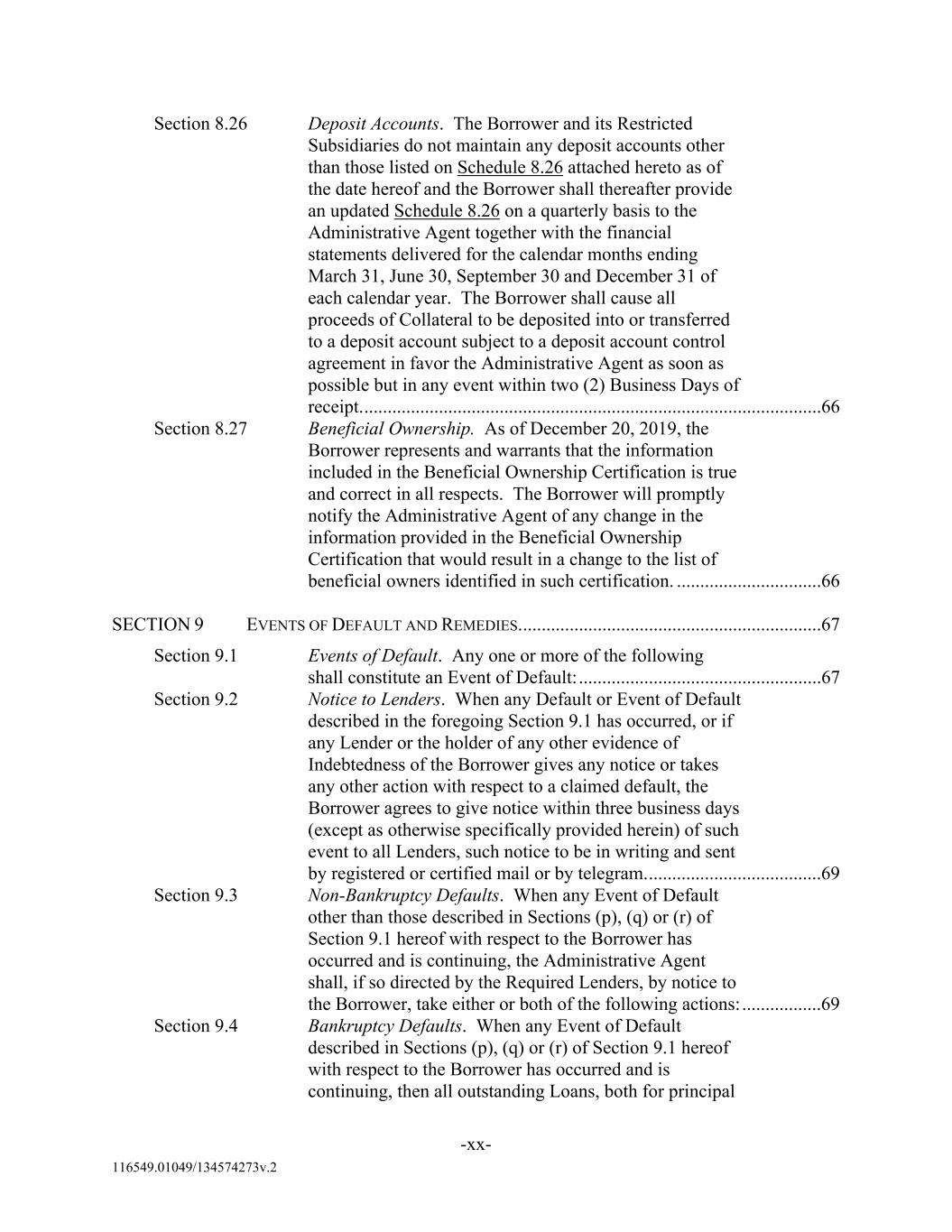 -xx- 116549.01049/134574273v.2 Section 8.26  Deposit Accounts. The Borrower and its Restricted Subsidiaries do not maintain any deposit accounts other than those listed on Schedule 8.26 attached hereto as of the date hereof and the Borrower shall thereafter provide an updated Schedule 8.26 on a quarterly basis to the Administrative Agent together with the financial statements delivered for the calendar months ending March 31, June 30, September 30 and December 31 of each calendar year. The Borrower shall cause all proceeds of Collateral to be deposited into or transferred to a deposit account subject to a deposit account control agreement in favor the Administrative Agent as soon as possible but in any event within two (2) Business Days of receipt. ..................................................................................................66  Section 8.27  Beneficial Ownership. As of December 20, 2019, the Borrower represents and warrants that the information included in the Beneficial Ownership Certification is true and correct in all respects. The Borrower will promptly notify the Administrative Agent of any change in the information provided in the Beneficial Ownership Certification that would result in a change to the list of beneficial owners identified in such certification. ...............................66  SECTION 9  EVENTS OF DEFAULT AND REMEDIES. ................................................................67  Section 9.1  Events of Default. Any one or more of the following shall constitute an Event of Default: ....................................................67  Section 9.2  Notice to Lenders. When any Default or Event of Default described in the foregoing Section 9.1 has occurred, or if any Lender or the holder of any other evidence of Indebtedness of the Borrower gives any notice or takes any other action with respect to a claimed default, the Borrower agrees to give notice within three business days (except as otherwise specifically provided herein) of such event to all Lenders, such notice to be in writing and sent by registered or certified mail or by telegram. .....................................69  Section 9.3  Non-Bankruptcy Defaults. When any Event of Default other than those described in Sections (p), (q) or (r) of Section 9.1 hereof with respect to the Borrower has occurred and is continuing, the Administrative Agent shall, if so directed by the Required Lenders, by notice to the Borrower, take either or both of the following actions: .................69  Section 9.4  Bankruptcy Defaults. When any Event of Default described in Sections (p), (q) or (r) of Section 9.1 hereof with respect to the Borrower has occurred and is continuing, then all outstanding Loans, both for principal