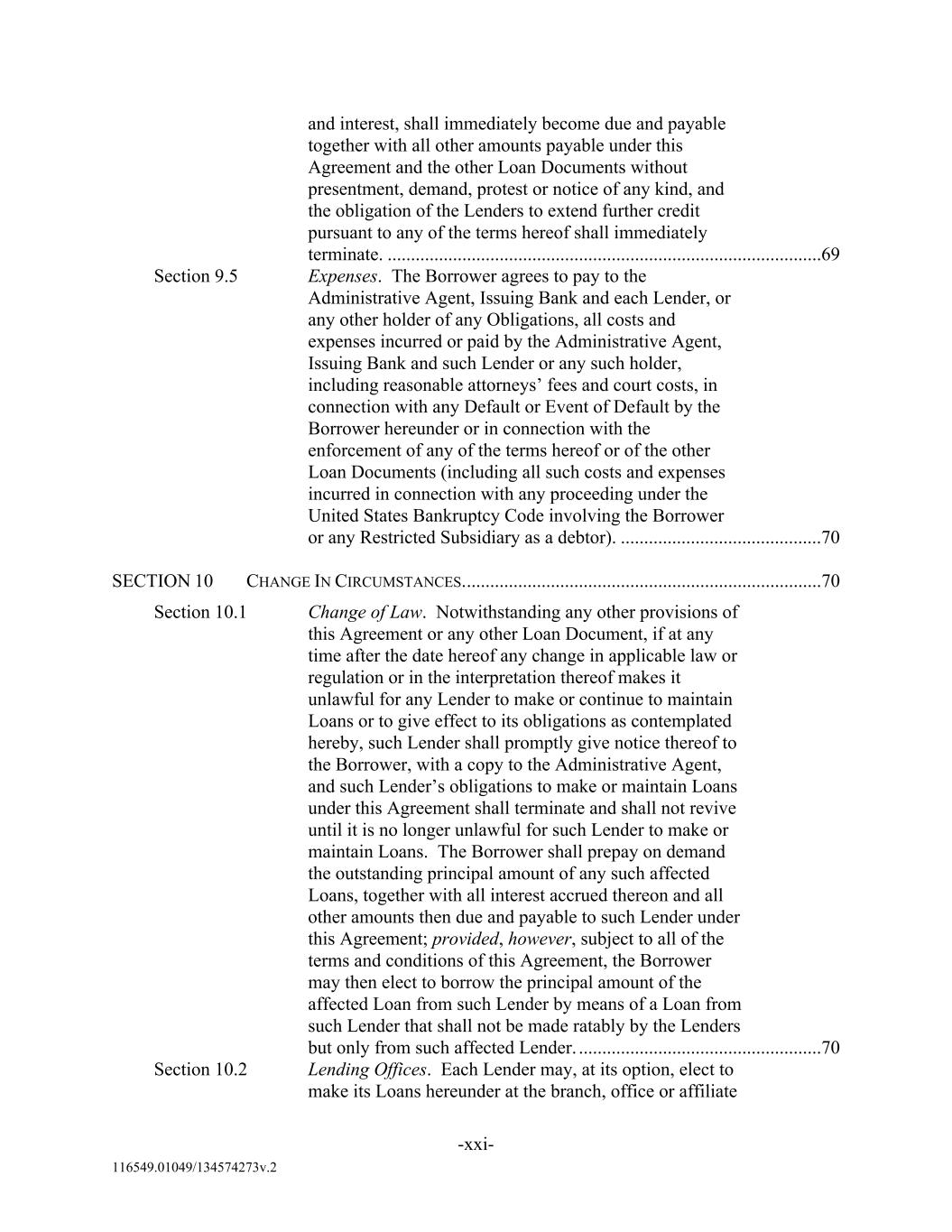 -xxi- 116549.01049/134574273v.2 and interest, shall immediately become due and payable together with all other amounts payable under this Agreement and the other Loan Documents without presentment, demand, protest or notice of any kind, and the obligation of the Lenders to extend further credit pursuant to any of the terms hereof shall immediately terminate. .............................................................................................69  Section 9.5  Expenses. The Borrower agrees to pay to the Administrative Agent, Issuing Bank and each Lender, or any other holder of any Obligations, all costs and expenses incurred or paid by the Administrative Agent, Issuing Bank and such Lender or any such holder, including reasonable attorneys’ fees and court costs, in connection with any Default or Event of Default by the Borrower hereunder or in connection with the enforcement of any of the terms hereof or of the other Loan Documents (including all such costs and expenses incurred in connection with any proceeding under the United States Bankruptcy Code involving the Borrower or any Restricted Subsidiary as a debtor). ...........................................70  SECTION 10  CHANGE IN CIRCUMSTANCES. ............................................................................70  Section 10.1  Change of Law. Notwithstanding any other provisions of this Agreement or any other Loan Document, if at any time after the date hereof any change in applicable law or regulation or in the interpretation thereof makes it unlawful for any Lender to make or continue to maintain Loans or to give effect to its obligations as contemplated hereby, such Lender shall promptly give notice thereof to the Borrower, with a copy to the Administrative Agent, and such Lender’s obligations to make or maintain Loans under this Agreement shall terminate and shall not revive until it is no longer unlawful for such Lender to make or maintain Loans. The Borrower shall prepay on demand the outstanding principal amount of any such affected Loans, together with all interest accrued thereon and all other amounts then due and payable to such Lender under this Agreement; provided, however, subject to all of the terms and conditions of this Agreement, the Borrower may then elect to borrow the principal amount of the affected Loan from such Lender by means of a Loan from such Lender that shall not be made ratably by the Lenders but only from such affected Lender. ....................................................70  Section 10.2  Lending Offices. Each Lender may, at its option, elect to make its Loans hereunder at the branch, office or affiliate