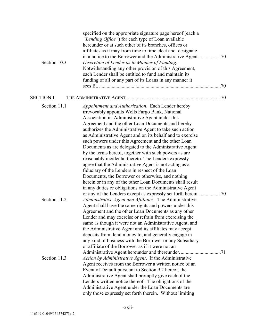 -xxii- 116549.01049/134574273v.2 specified on the appropriate signature page hereof (each a “Lending Office”) for each type of Loan available hereunder or at such other of its branches, offices or affiliates as it may from time to time elect and designate in a notice to the Borrower and the Administrative Agent. .................70  Section 10.3  Discretion of Lender as to Manner of Funding. Notwithstanding any other provision of this Agreement, each Lender shall be entitled to fund and maintain its funding of all or any part of its Loans in any manner it sees fit. .................................................................................................70  SECTION 11  THE ADMINISTRATIVE AGENT. ..........................................................................70  Section 11.1  Appointment and Authorization. Each Lender hereby irrevocably appoints Wells Fargo Bank, National Association its Administrative Agent under this Agreement and the other Loan Documents and hereby authorizes the Administrative Agent to take such action as Administrative Agent and on its behalf and to exercise such powers under this Agreement and the other Loan Documents as are delegated to the Administrative Agent by the terms hereof, together with such powers as are reasonably incidental thereto. The Lenders expressly agree that the Administrative Agent is not acting as a fiduciary of the Lenders in respect of the Loan Documents, the Borrower or otherwise, and nothing herein or in any of the other Loan Documents shall result in any duties or obligations on the Administrative Agent or any of the Lenders except as expressly set forth herein. .................70  Section 11.2  Administrative Agent and Affiliates. The Administrative Agent shall have the same rights and powers under this Agreement and the other Loan Documents as any other Lender and may exercise or refrain from exercising the same as though it were not an Administrative Agent, and the Administrative Agent and its affiliates may accept deposits from, lend money to, and generally engage in any kind of business with the Borrower or any Subsidiary or affiliate of the Borrower as if it were not an Administrative Agent hereunder and thereunder. ................................71  Section 11.3  Action by Administrative Agent. If the Administrative Agent receives from the Borrower a written notice of an Event of Default pursuant to Section 9.2 hereof, the Administrative Agent shall promptly give each of the Lenders written notice thereof. The obligations of the Administrative Agent under the Loan Documents are only those expressly set forth therein. Without limiting