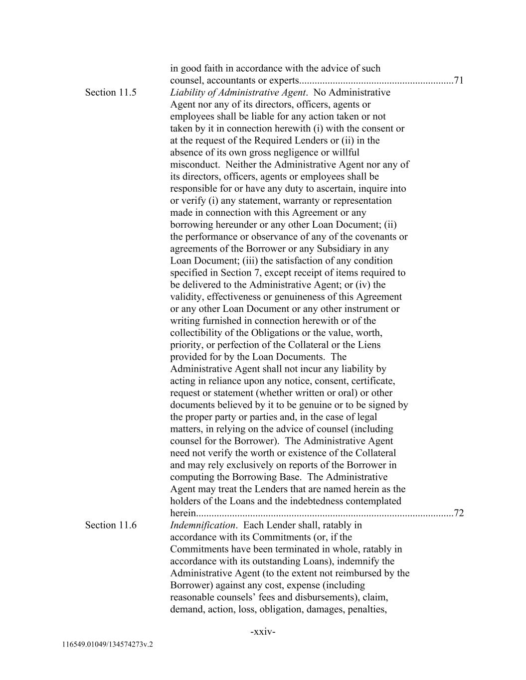 -xxiv- 116549.01049/134574273v.2 in good faith in accordance with the advice of such counsel, accountants or experts. ...........................................................71  Section 11.5  Liability of Administrative Agent. No Administrative Agent nor any of its directors, officers, agents or employees shall be liable for any action taken or not taken by it in connection herewith (i) with the consent or at the request of the Required Lenders or (ii) in the absence of its own gross negligence or willful misconduct. Neither the Administrative Agent nor any of its directors, officers, agents or employees shall be responsible for or have any duty to ascertain, inquire into or verify (i) any statement, warranty or representation made in connection with this Agreement or any borrowing hereunder or any other Loan Document; (ii) the performance or observance of any of the covenants or agreements of the Borrower or any Subsidiary in any Loan Document; (iii) the satisfaction of any condition specified in Section 7, except receipt of items required to be delivered to the Administrative Agent; or (iv) the validity, effectiveness or genuineness of this Agreement or any other Loan Document or any other instrument or writing furnished in connection herewith or of the collectibility of the Obligations or the value, worth, priority, or perfection of the Collateral or the Liens provided for by the Loan Documents. The Administrative Agent shall not incur any liability by acting in reliance upon any notice, consent, certificate, request or statement (whether written or oral) or other documents believed by it to be genuine or to be signed by the proper party or parties and, in the case of legal matters, in relying on the advice of counsel (including counsel for the Borrower). The Administrative Agent need not verify the worth or existence of the Collateral and may rely exclusively on reports of the Borrower in computing the Borrowing Base. The Administrative Agent may treat the Lenders that are named herein as the holders of the Loans and the indebtedness contemplated herein....................................................................................................72  Section 11.6  Indemnification. Each Lender shall, ratably in accordance with its Commitments (or, if the Commitments have been terminated in whole, ratably in accordance with its outstanding Loans), indemnify the Administrative Agent (to the extent not reimbursed by the Borrower) against any cost, expense (including reasonable counsels’ fees and disbursements), claim, demand, action, loss, obligation, damages, penalties,
