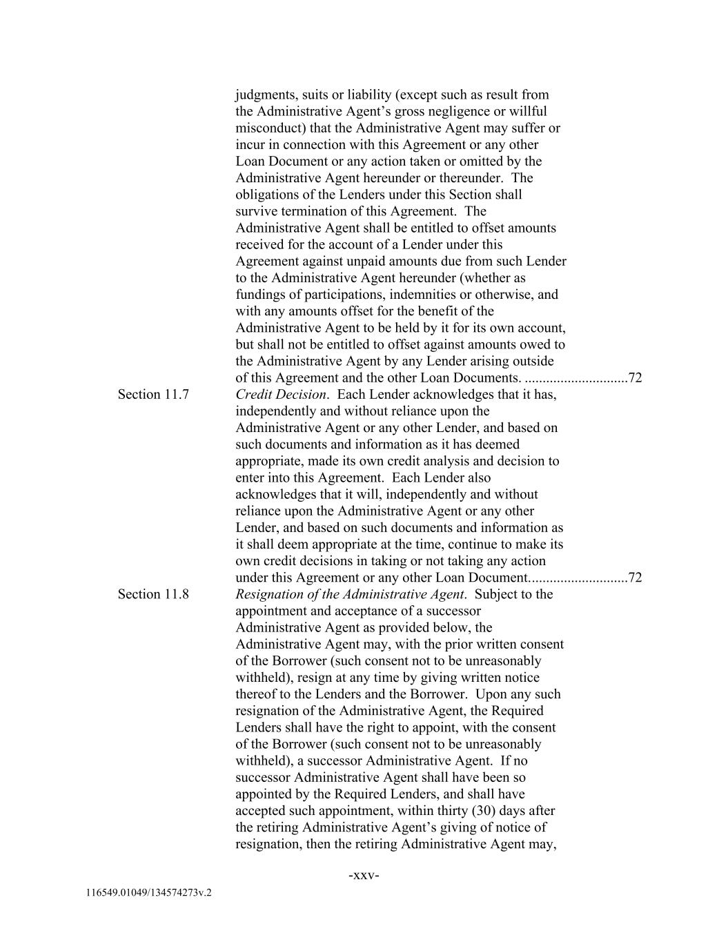 -xxv- 116549.01049/134574273v.2 judgments, suits or liability (except such as result from the Administrative Agent’s gross negligence or willful misconduct) that the Administrative Agent may suffer or incur in connection with this Agreement or any other Loan Document or any action taken or omitted by the Administrative Agent hereunder or thereunder. The obligations of the Lenders under this Section shall survive termination of this Agreement. The Administrative Agent shall be entitled to offset amounts received for the account of a Lender under this Agreement against unpaid amounts due from such Lender to the Administrative Agent hereunder (whether as fundings of participations, indemnities or otherwise, and with any amounts offset for the benefit of the Administrative Agent to be held by it for its own account, but shall not be entitled to offset against amounts owed to the Administrative Agent by any Lender arising outside of this Agreement and the other Loan Documents. .............................72  Section 11.7  Credit Decision. Each Lender acknowledges that it has, independently and without reliance upon the Administrative Agent or any other Lender, and based on such documents and information as it has deemed appropriate, made its own credit analysis and decision to enter into this Agreement. Each Lender also acknowledges that it will, independently and without reliance upon the Administrative Agent or any other Lender, and based on such documents and information as it shall deem appropriate at the time, continue to make its own credit decisions in taking or not taking any action under this Agreement or any other Loan Document. ...........................72  Section 11.8  Resignation of the Administrative Agent. Subject to the appointment and acceptance of a successor Administrative Agent as provided below, the Administrative Agent may, with the prior written consent of the Borrower (such consent not to be unreasonably withheld), resign at any time by giving written notice thereof to the Lenders and the Borrower. Upon any such resignation of the Administrative Agent, the Required Lenders shall have the right to appoint, with the consent of the Borrower (such consent not to be unreasonably withheld), a successor Administrative Agent. If no successor Administrative Agent shall have been so appointed by the Required Lenders, and shall have accepted such appointment, within thirty (30) days after the retiring Administrative Agent’s giving of notice of resignation, then the retiring Administrative Agent may,