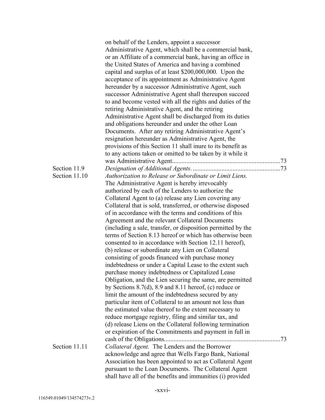 -xxvi- 116549.01049/134574273v.2 on behalf of the Lenders, appoint a successor Administrative Agent, which shall be a commercial bank, or an Affiliate of a commercial bank, having an office in the United States of America and having a combined capital and surplus of at least $200,000,000. Upon the acceptance of its appointment as Administrative Agent hereunder by a successor Administrative Agent, such successor Administrative Agent shall thereupon succeed to and become vested with all the rights and duties of the retiring Administrative Agent, and the retiring Administrative Agent shall be discharged from its duties and obligations hereunder and under the other Loan Documents. After any retiring Administrative Agent’s resignation hereunder as Administrative Agent, the provisions of this Section 11 shall inure to its benefit as to any actions taken or omitted to be taken by it while it was Administrative Agent....................................................................73  Section 11.9  Designation of Additional Agents. .......................................................73  Section 11.10  Authorization to Release or Subordinate or Limit Liens. The Administrative Agent is hereby irrevocably authorized by each of the Lenders to authorize the Collateral Agent to (a) release any Lien covering any Collateral that is sold, transferred, or otherwise disposed of in accordance with the terms and conditions of this Agreement and the relevant Collateral Documents (including a sale, transfer, or disposition permitted by the terms of Section 8.13 hereof or which has otherwise been consented to in accordance with Section 12.11 hereof), (b) release or subordinate any Lien on Collateral consisting of goods financed with purchase money indebtedness or under a Capital Lease to the extent such purchase money indebtedness or Capitalized Lease Obligation, and the Lien securing the same, are permitted by Sections 8.7(d), 8.9 and 8.11 hereof, (c) reduce or limit the amount of the indebtedness secured by any particular item of Collateral to an amount not less than the estimated value thereof to the extent necessary to reduce mortgage registry, filing and similar tax, and (d) release Liens on the Collateral following termination or expiration of the Commitments and payment in full in cash of the Obligations. ........................................................................73  Section 11.11  Collateral Agent. The Lenders and the Borrower acknowledge and agree that Wells Fargo Bank, National Association has been appointed to act as Collateral Agent pursuant to the Loan Documents. The Collateral Agent shall have all of the benefits and immunities (i) provided