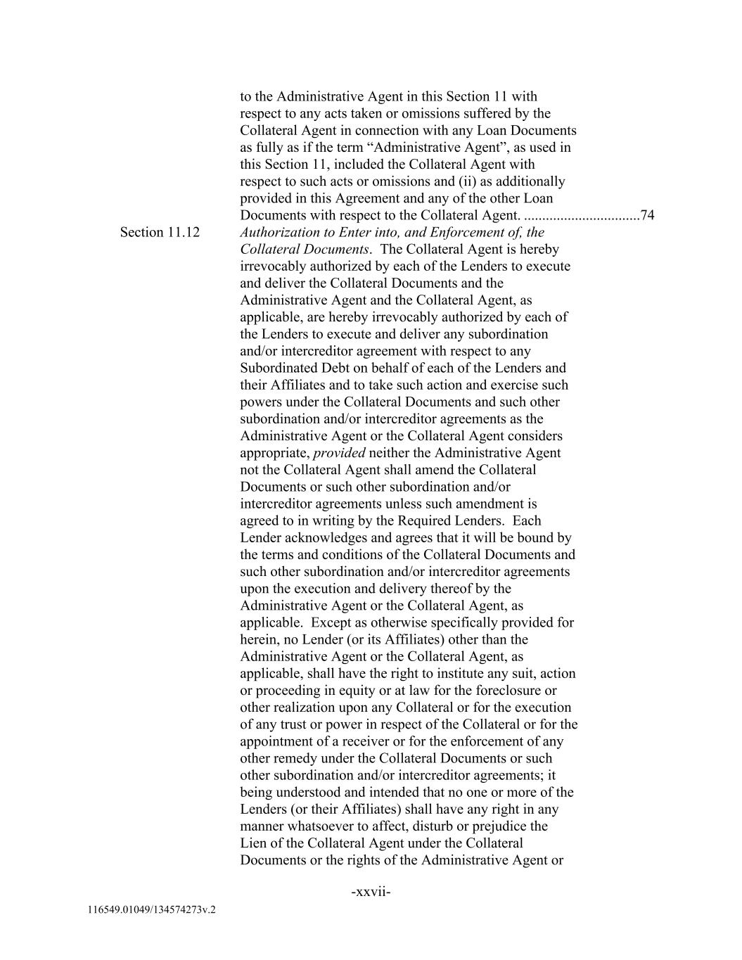 -xxvii- 116549.01049/134574273v.2 to the Administrative Agent in this Section 11 with respect to any acts taken or omissions suffered by the Collateral Agent in connection with any Loan Documents as fully as if the term “Administrative Agent”, as used in this Section 11, included the Collateral Agent with respect to such acts or omissions and (ii) as additionally provided in this Agreement and any of the other Loan Documents with respect to the Collateral Agent. ................................74  Section 11.12  Authorization to Enter into, and Enforcement of, the Collateral Documents. The Collateral Agent is hereby irrevocably authorized by each of the Lenders to execute and deliver the Collateral Documents and the Administrative Agent and the Collateral Agent, as applicable, are hereby irrevocably authorized by each of the Lenders to execute and deliver any subordination and/or intercreditor agreement with respect to any Subordinated Debt on behalf of each of the Lenders and their Affiliates and to take such action and exercise such powers under the Collateral Documents and such other subordination and/or intercreditor agreements as the Administrative Agent or the Collateral Agent considers appropriate, provided neither the Administrative Agent not the Collateral Agent shall amend the Collateral Documents or such other subordination and/or intercreditor agreements unless such amendment is agreed to in writing by the Required Lenders. Each Lender acknowledges and agrees that it will be bound by the terms and conditions of the Collateral Documents and such other subordination and/or intercreditor agreements upon the execution and delivery thereof by the Administrative Agent or the Collateral Agent, as applicable. Except as otherwise specifically provided for herein, no Lender (or its Affiliates) other than the Administrative Agent or the Collateral Agent, as applicable, shall have the right to institute any suit, action or proceeding in equity or at law for the foreclosure or other realization upon any Collateral or for the execution of any trust or power in respect of the Collateral or for the appointment of a receiver or for the enforcement of any other remedy under the Collateral Documents or such other subordination and/or intercreditor agreements; it being understood and intended that no one or more of the Lenders (or their Affiliates) shall have any right in any manner whatsoever to affect, disturb or prejudice the Lien of the Collateral Agent under the Collateral Documents or the rights of the Administrative Agent or