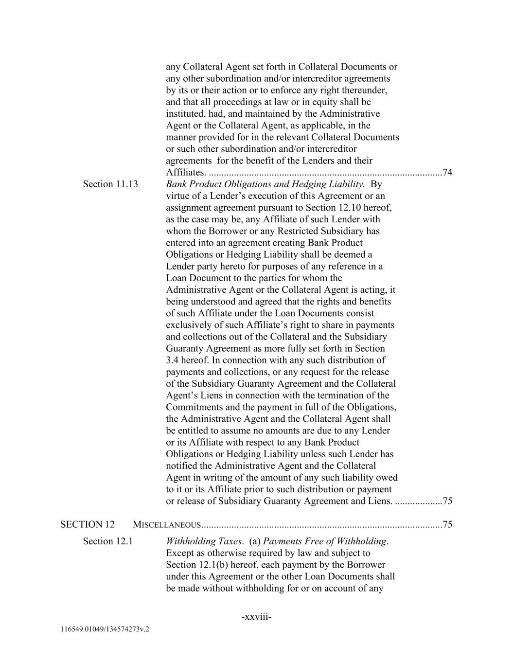 -xxviii- 116549.01049/134574273v.2 any Collateral Agent set forth in Collateral Documents or any other subordination and/or intercreditor agreements by its or their action or to enforce any right thereunder, and that all proceedings at law or in equity shall be instituted, had, and maintained by the Administrative Agent or the Collateral Agent, as applicable, in the manner provided for in the relevant Collateral Documents or such other subordination and/or intercreditor agreements for the benefit of the Lenders and their Affiliates. .............................................................................................74  Section 11.13  Bank Product Obligations and Hedging Liability. By virtue of a Lender’s execution of this Agreement or an assignment agreement pursuant to Section 12.10 hereof, as the case may be, any Affiliate of such Lender with whom the Borrower or any Restricted Subsidiary has entered into an agreement creating Bank Product Obligations or Hedging Liability shall be deemed a Lender party hereto for purposes of any reference in a Loan Document to the parties for whom the Administrative Agent or the Collateral Agent is acting, it being understood and agreed that the rights and benefits of such Affiliate under the Loan Documents consist exclusively of such Affiliate’s right to share in payments and collections out of the Collateral and the Subsidiary Guaranty Agreement as more fully set forth in Section 3.4 hereof. In connection with any such distribution of payments and collections, or any request for the release of the Subsidiary Guaranty Agreement and the Collateral Agent’s Liens in connection with the termination of the Commitments and the payment in full of the Obligations, the Administrative Agent and the Collateral Agent shall be entitled to assume no amounts are due to any Lender or its Affiliate with respect to any Bank Product Obligations or Hedging Liability unless such Lender has notified the Administrative Agent and the Collateral Agent in writing of the amount of any such liability owed to it or its Affiliate prior to such distribution or payment or release of Subsidiary Guaranty Agreement and Liens. ...................75  SECTION 12  MISCELLANEOUS. ...............................................................................................75  Section 12.1  Withholding Taxes. (a) Payments Free of Withholding. Except as otherwise required by law and subject to Section 12.1(b) hereof, each payment by the Borrower under this Agreement or the other Loan Documents shall be made without withholding for or on account of any