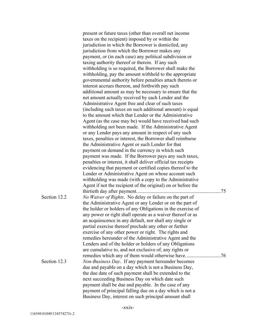 -xxix- 116549.01049/134574273v.2 present or future taxes (other than overall net income taxes on the recipient) imposed by or within the jurisdiction in which the Borrower is domiciled, any jurisdiction from which the Borrower makes any payment, or (in each case) any political subdivision or taxing authority thereof or therein. If any such withholding is so required, the Borrower shall make the withholding, pay the amount withheld to the appropriate governmental authority before penalties attach thereto or interest accrues thereon, and forthwith pay such additional amount as may be necessary to ensure that the net amount actually received by each Lender and the Administrative Agent free and clear of such taxes (including such taxes on such additional amount) is equal to the amount which that Lender or the Administrative Agent (as the case may be) would have received had such withholding not been made. If the Administrative Agent or any Lender pays any amount in respect of any such taxes, penalties or interest, the Borrower shall reimburse the Administrative Agent or such Lender for that payment on demand in the currency in which such payment was made. If the Borrower pays any such taxes, penalties or interest, it shall deliver official tax receipts evidencing that payment or certified copies thereof to the Lender or Administrative Agent on whose account such withholding was made (with a copy to the Administrative Agent if not the recipient of the original) on or before the thirtieth day after payment. ..................................................................75  Section 12.2  No Waiver of Rights. No delay or failure on the part of the Administrative Agent or any Lender or on the part of the holder or holders of any Obligations in the exercise of any power or right shall operate as a waiver thereof or as an acquiescence in any default, nor shall any single or partial exercise thereof preclude any other or further exercise of any other power or right. The rights and remedies hereunder of the Administrative Agent and the Lenders and of the holder or holders of any Obligations are cumulative to, and not exclusive of, any rights or remedies which any of them would otherwise have. ...........................76  Section 12.3  Non-Business Day. If any payment hereunder becomes due and payable on a day which is not a Business Day, the due date of such payment shall be extended to the next succeeding Business Day on which date such payment shall be due and payable. In the case of any payment of principal falling due on a day which is not a Business Day, interest on such principal amount shall