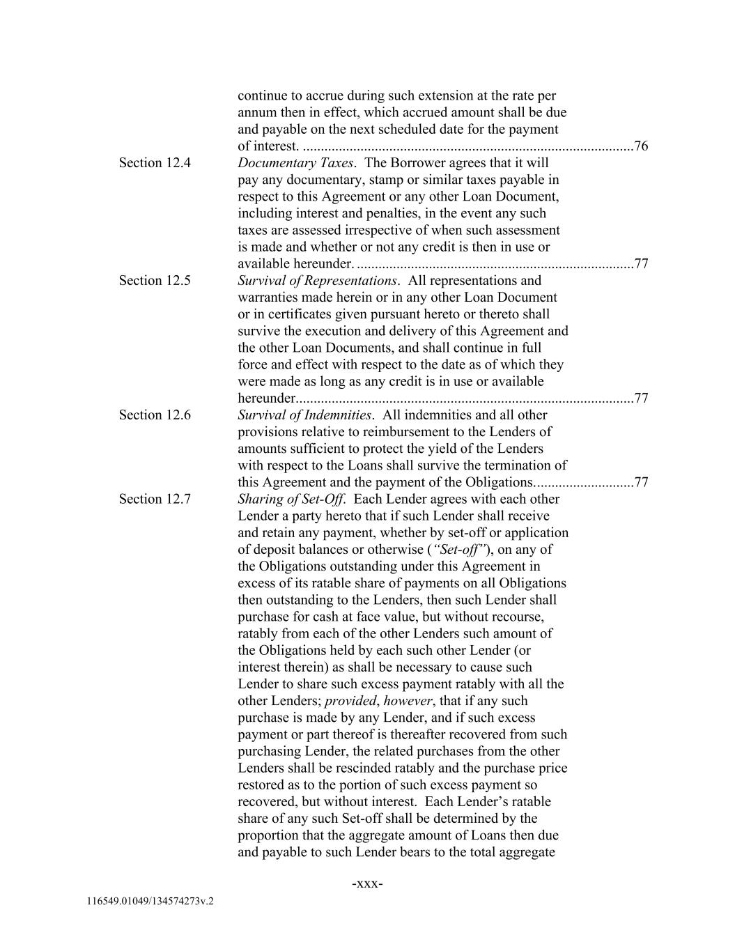 -xxx- 116549.01049/134574273v.2 continue to accrue during such extension at the rate per annum then in effect, which accrued amount shall be due and payable on the next scheduled date for the payment of interest. ............................................................................................76  Section 12.4  Documentary Taxes. The Borrower agrees that it will pay any documentary, stamp or similar taxes payable in respect to this Agreement or any other Loan Document, including interest and penalties, in the event any such taxes are assessed irrespective of when such assessment is made and whether or not any credit is then in use or available hereunder. .............................................................................77  Section 12.5  Survival of Representations. All representations and warranties made herein or in any other Loan Document or in certificates given pursuant hereto or thereto shall survive the execution and delivery of this Agreement and the other Loan Documents, and shall continue in full force and effect with respect to the date as of which they were made as long as any credit is in use or available hereunder. .............................................................................................77  Section 12.6  Survival of Indemnities. All indemnities and all other provisions relative to reimbursement to the Lenders of amounts sufficient to protect the yield of the Lenders with respect to the Loans shall survive the termination of this Agreement and the payment of the Obligations. ...........................77  Section 12.7  Sharing of Set-Off. Each Lender agrees with each other Lender a party hereto that if such Lender shall receive and retain any payment, whether by set-off or application of deposit balances or otherwise (“Set-off”), on any of the Obligations outstanding under this Agreement in excess of its ratable share of payments on all Obligations then outstanding to the Lenders, then such Lender shall purchase for cash at face value, but without recourse, ratably from each of the other Lenders such amount of the Obligations held by each such other Lender (or interest therein) as shall be necessary to cause such Lender to share such excess payment ratably with all the other Lenders; provided, however, that if any such purchase is made by any Lender, and if such excess payment or part thereof is thereafter recovered from such purchasing Lender, the related purchases from the other Lenders shall be rescinded ratably and the purchase price restored as to the portion of such excess payment so recovered, but without interest. Each Lender’s ratable share of any such Set-off shall be determined by the proportion that the aggregate amount of Loans then due and payable to such Lender bears to the total aggregate