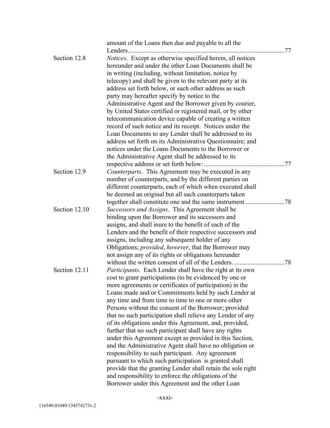 -xxxi- 116549.01049/134574273v.2 amount of the Loans then due and payable to all the Lenders. ................................................................................................77  Section 12.8  Notices. Except as otherwise specified herein, all notices hereunder and under the other Loan Documents shall be in writing (including, without limitation, notice by telecopy) and shall be given to the relevant party at its address set forth below, or such other address as such party may hereafter specify by notice to the Administrative Agent and the Borrower given by courier, by United States certified or registered mail, or by other telecommunication device capable of creating a written record of such notice and its receipt. Notices under the Loan Documents to any Lender shall be addressed to its address set forth on its Administrative Questionnaire; and notices under the Loans Documents to the Borrower or the Administrative Agent shall be addressed to its respective address or set forth below: ..................................................77  Section 12.9  Counterparts. This Agreement may be executed in any number of counterparts, and by the different parties on different counterparts, each of which when executed shall be deemed an original but all such counterparts taken together shall constitute one and the same instrument. ........................78  Section 12.10  Successors and Assigns. This Agreement shall be binding upon the Borrower and its successors and assigns, and shall inure to the benefit of each of the Lenders and the benefit of their respective successors and assigns, including any subsequent holder of any Obligations; provided, however, that the Borrower may not assign any of its rights or obligations hereunder without the written consent of all of the Lenders. ...............................78  Section 12.11  Participants. Each Lender shall have the right at its own cost to grant participations (to be evidenced by one or more agreements or certificates of participation) in the Loans made and/or Commitments held by such Lender at any time and from time to time to one or more other Persons without the consent of the Borrower; provided that no such participation shall relieve any Lender of any of its obligations under this Agreement, and, provided, further that no such participant shall have any rights under this Agreement except as provided in this Section, and the Administrative Agent shall have no obligation or responsibility to such participant. Any agreement pursuant to which such participation is granted shall provide that the granting Lender shall retain the sole right and responsibility to enforce the obligations of the Borrower under this Agreement and the other Loan