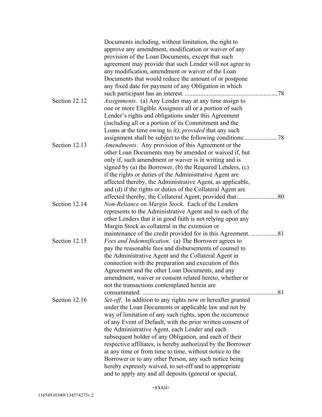 -xxxii- 116549.01049/134574273v.2 Documents including, without limitation, the right to approve any amendment, modification or waiver of any provision of the Loan Documents, except that such agreement may provide that such Lender will not agree to any modification, amendment or waiver of the Loan Documents that would reduce the amount of or postpone any fixed date for payment of any Obligation in which such participant has an interest. ...........................................................78  Section 12.12  Assignments. (a) Any Lender may at any time assign to one or more Eligible Assignees all or a portion of such Lender’s rights and obligations under this Agreement (including all or a portion of its Commitment and the Loans at the time owing to it); provided that any such assignment shall be subject to the following conditions: .....................78  Section 12.13  Amendments. Any provision of this Agreement or the other Loan Documents may be amended or waived if, but only if, such amendment or waiver is in writing and is signed by (a) the Borrower, (b) the Required Lenders, (c) if the rights or duties of the Administrative Agent are affected thereby, the Administrative Agent, as applicable, and (d) if the rights or duties of the Collateral Agent are affected thereby, the Collateral Agent; provided that: .........................80  Section 12.14  Non-Reliance on Margin Stock. Each of the Lenders represents to the Administrative Agent and to each of the other Lenders that it in good faith is not relying upon any Margin Stock as collateral in the extension or maintenance of the credit provided for in this Agreement. .................81  Section 12.15  Fees and Indemnification. (a) The Borrower agrees to pay the reasonable fees and disbursements of counsel to the Administrative Agent and the Collateral Agent in connection with the preparation and execution of this Agreement and the other Loan Documents, and any amendment, waiver or consent related hereto, whether or not the transactions contemplated herein are consummated. ......................................................................................81  Section 12.16  Set-off. In addition to any rights now or hereafter granted under the Loan Documents or applicable law and not by way of limitation of any such rights, upon the occurrence of any Event of Default, with the prior written consent of the Administrative Agent, each Lender and each subsequent holder of any Obligation, and each of their respective affiliates, is hereby authorized by the Borrower at any time or from time to time, without notice to the Borrower or to any other Person, any such notice being hereby expressly waived, to set-off and to appropriate and to apply any and all deposits (general or special,
