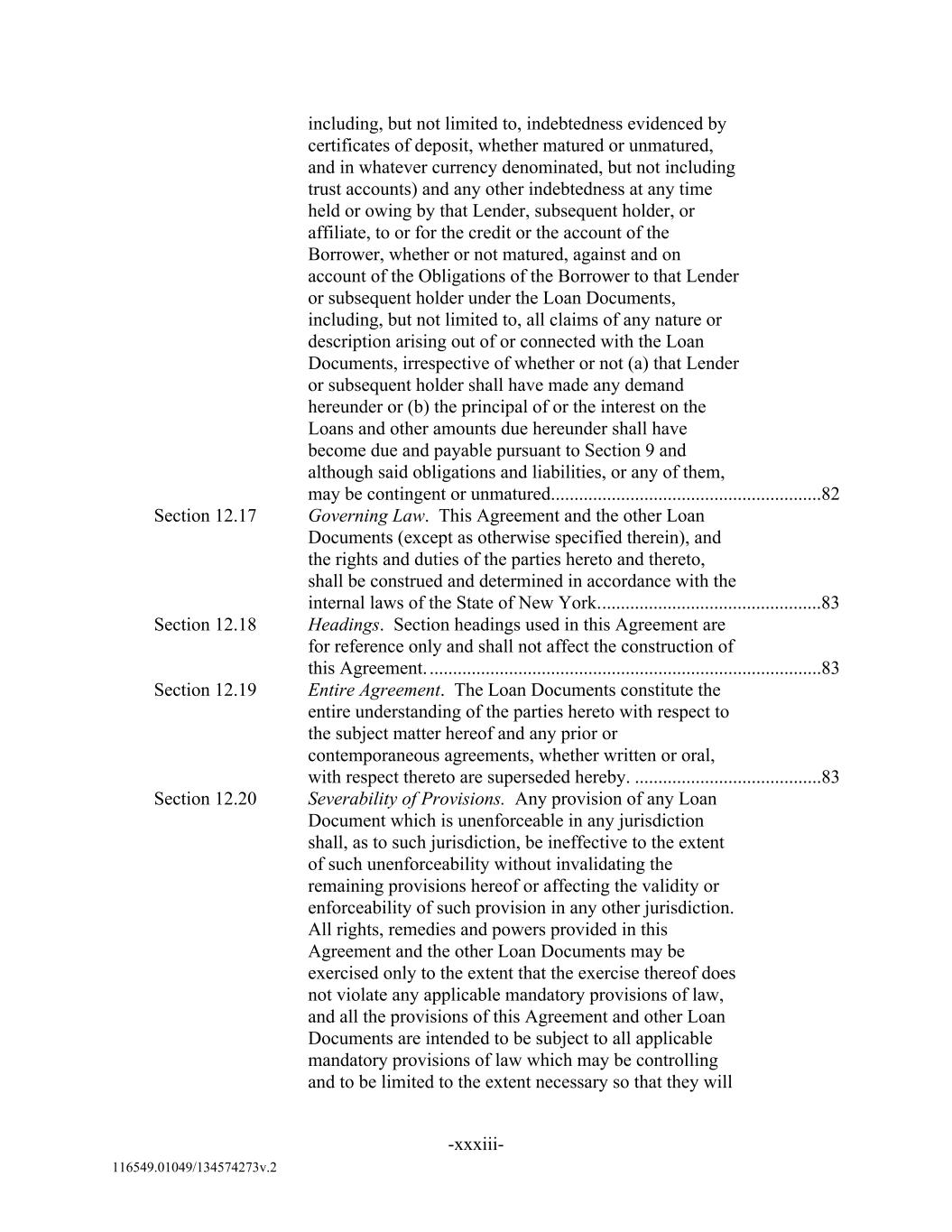 -xxxiii- 116549.01049/134574273v.2 including, but not limited to, indebtedness evidenced by certificates of deposit, whether matured or unmatured, and in whatever currency denominated, but not including trust accounts) and any other indebtedness at any time held or owing by that Lender, subsequent holder, or affiliate, to or for the credit or the account of the Borrower, whether or not matured, against and on account of the Obligations of the Borrower to that Lender or subsequent holder under the Loan Documents, including, but not limited to, all claims of any nature or description arising out of or connected with the Loan Documents, irrespective of whether or not (a) that Lender or subsequent holder shall have made any demand hereunder or (b) the principal of or the interest on the Loans and other amounts due hereunder shall have become due and payable pursuant to Section 9 and although said obligations and liabilities, or any of them, may be contingent or unmatured. .........................................................82  Section 12.17  Governing Law. This Agreement and the other Loan Documents (except as otherwise specified therein), and the rights and duties of the parties hereto and thereto, shall be construed and determined in accordance with the internal laws of the State of New York. ...............................................83  Section 12.18  Headings. Section headings used in this Agreement are for reference only and shall not affect the construction of this Agreement. ....................................................................................83  Section 12.19  Entire Agreement. The Loan Documents constitute the entire understanding of the parties hereto with respect to the subject matter hereof and any prior or contemporaneous agreements, whether written or oral, with respect thereto are superseded hereby. ........................................83  Section 12.20  Severability of Provisions. Any provision of any Loan Document which is unenforceable in any jurisdiction shall, as to such jurisdiction, be ineffective to the extent of such unenforceability without invalidating the remaining provisions hereof or affecting the validity or enforceability of such provision in any other jurisdiction. All rights, remedies and powers provided in this Agreement and the other Loan Documents may be exercised only to the extent that the exercise thereof does not violate any applicable mandatory provisions of law, and all the provisions of this Agreement and other Loan Documents are intended to be subject to all applicable mandatory provisions of law which may be controlling and to be limited to the extent necessary so that they will