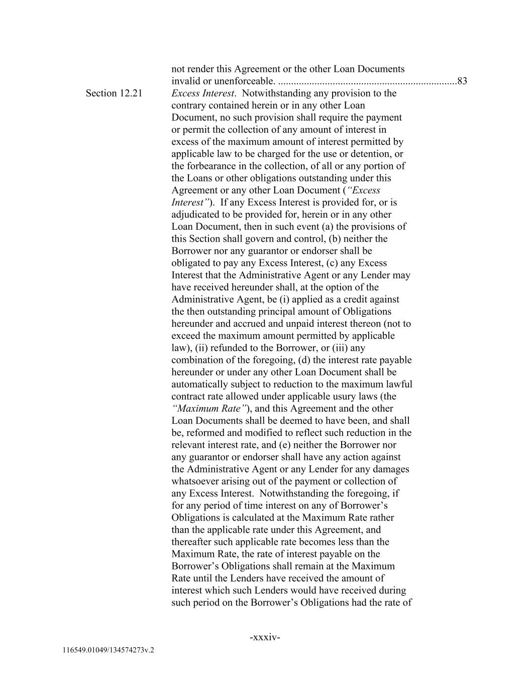 -xxxiv- 116549.01049/134574273v.2 not render this Agreement or the other Loan Documents invalid or unenforceable. .....................................................................83  Section 12.21  Excess Interest. Notwithstanding any provision to the contrary contained herein or in any other Loan Document, no such provision shall require the payment or permit the collection of any amount of interest in excess of the maximum amount of interest permitted by applicable law to be charged for the use or detention, or the forbearance in the collection, of all or any portion of the Loans or other obligations outstanding under this Agreement or any other Loan Document (“Excess Interest”). If any Excess Interest is provided for, or is adjudicated to be provided for, herein or in any other Loan Document, then in such event (a) the provisions of this Section shall govern and control, (b) neither the Borrower nor any guarantor or endorser shall be obligated to pay any Excess Interest, (c) any Excess Interest that the Administrative Agent or any Lender may have received hereunder shall, at the option of the Administrative Agent, be (i) applied as a credit against the then outstanding principal amount of Obligations hereunder and accrued and unpaid interest thereon (not to exceed the maximum amount permitted by applicable law), (ii) refunded to the Borrower, or (iii) any combination of the foregoing, (d) the interest rate payable hereunder or under any other Loan Document shall be automatically subject to reduction to the maximum lawful contract rate allowed under applicable usury laws (the “Maximum Rate”), and this Agreement and the other Loan Documents shall be deemed to have been, and shall be, reformed and modified to reflect such reduction in the relevant interest rate, and (e) neither the Borrower nor any guarantor or endorser shall have any action against the Administrative Agent or any Lender for any damages whatsoever arising out of the payment or collection of any Excess Interest. Notwithstanding the foregoing, if for any period of time interest on any of Borrower’s Obligations is calculated at the Maximum Rate rather than the applicable rate under this Agreement, and thereafter such applicable rate becomes less than the Maximum Rate, the rate of interest payable on the Borrower’s Obligations shall remain at the Maximum Rate until the Lenders have received the amount of interest which such Lenders would have received during such period on the Borrower’s Obligations had the rate of