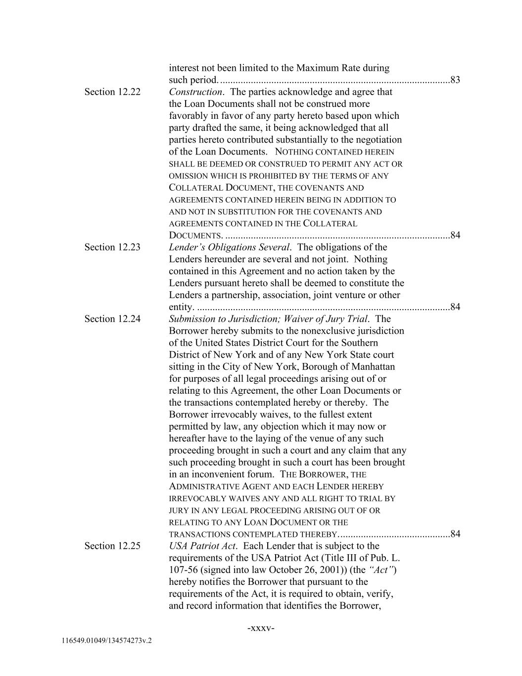 -xxxv- 116549.01049/134574273v.2 interest not been limited to the Maximum Rate during such period. ..........................................................................................83  Section 12.22  Construction. The parties acknowledge and agree that the Loan Documents shall not be construed more favorably in favor of any party hereto based upon which party drafted the same, it being acknowledged that all parties hereto contributed substantially to the negotiation of the Loan Documents. NOTHING CONTAINED HEREIN SHALL BE DEEMED OR CONSTRUED TO PERMIT ANY ACT OR OMISSION WHICH IS PROHIBITED BY THE TERMS OF ANY COLLATERAL DOCUMENT, THE COVENANTS AND AGREEMENTS CONTAINED HEREIN BEING IN ADDITION TO AND NOT IN SUBSTITUTION FOR THE COVENANTS AND AGREEMENTS CONTAINED IN THE COLLATERAL DOCUMENTS. ........................................................................................84  Section 12.23  Lender’s Obligations Several. The obligations of the Lenders hereunder are several and not joint. Nothing contained in this Agreement and no action taken by the Lenders pursuant hereto shall be deemed to constitute the Lenders a partnership, association, joint venture or other entity. ...................................................................................................84  Section 12.24  Submission to Jurisdiction; Waiver of Jury Trial. The Borrower hereby submits to the nonexclusive jurisdiction of the United States District Court for the Southern District of New York and of any New York State court sitting in the City of New York, Borough of Manhattan for purposes of all legal proceedings arising out of or relating to this Agreement, the other Loan Documents or the transactions contemplated hereby or thereby. The Borrower irrevocably waives, to the fullest extent permitted by law, any objection which it may now or hereafter have to the laying of the venue of any such proceeding brought in such a court and any claim that any such proceeding brought in such a court has been brought in an inconvenient forum. THE BORROWER, THE ADMINISTRATIVE AGENT AND EACH LENDER HEREBY IRREVOCABLY WAIVES ANY AND ALL RIGHT TO TRIAL BY JURY IN ANY LEGAL PROCEEDING ARISING OUT OF OR RELATING TO ANY LOAN DOCUMENT OR THE TRANSACTIONS CONTEMPLATED THEREBY. ...........................................84  Section 12.25  USA Patriot Act. Each Lender that is subject to the requirements of the USA Patriot Act (Title III of Pub. L. 107-56 (signed into law October 26, 2001)) (the “Act”) hereby notifies the Borrower that pursuant to the requirements of the Act, it is required to obtain, verify, and record information that identifies the Borrower,