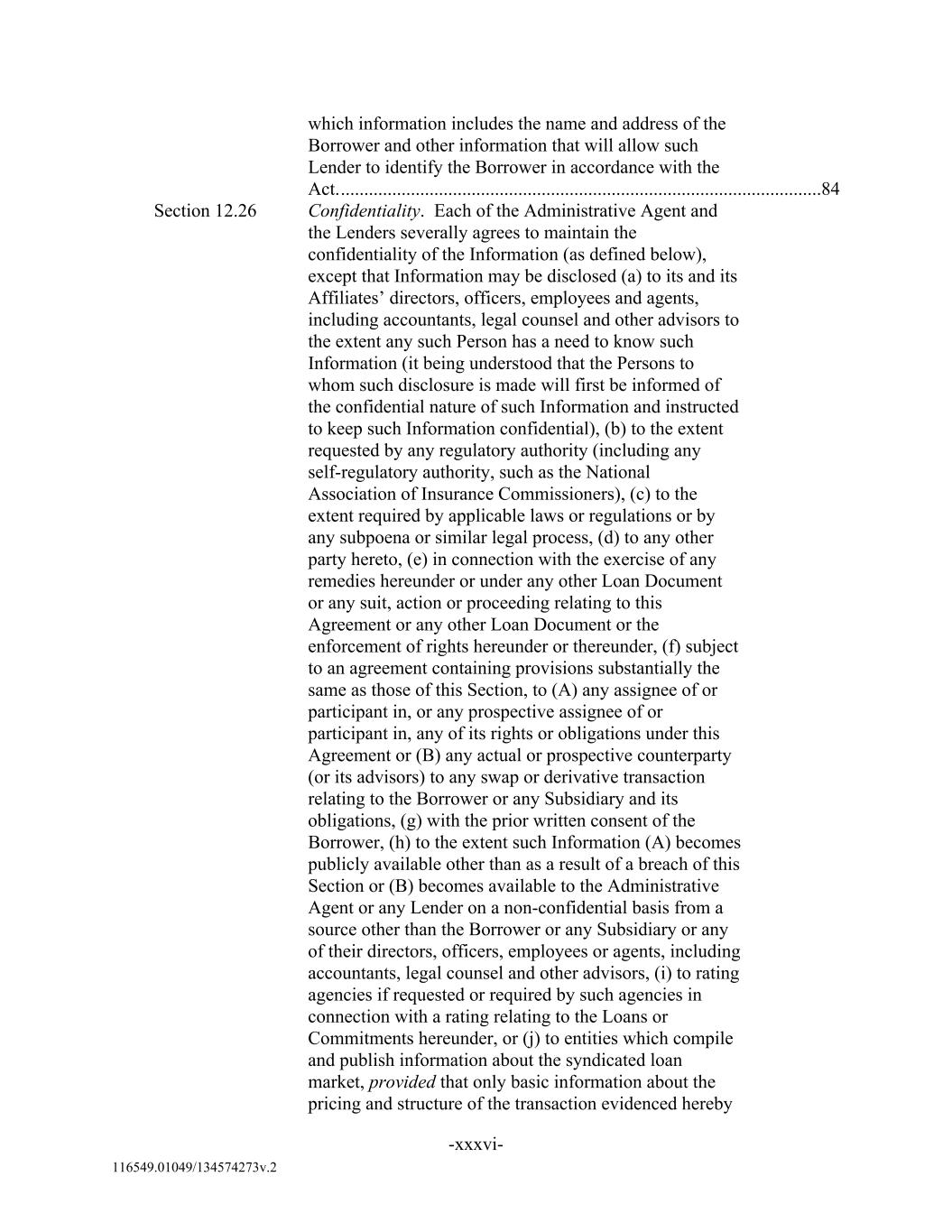 -xxxvi- 116549.01049/134574273v.2 which information includes the name and address of the Borrower and other information that will allow such Lender to identify the Borrower in accordance with the Act. .......................................................................................................84  Section 12.26  Confidentiality. Each of the Administrative Agent and the Lenders severally agrees to maintain the confidentiality of the Information (as defined below), except that Information may be disclosed (a) to its and its Affiliates’ directors, officers, employees and agents, including accountants, legal counsel and other advisors to the extent any such Person has a need to know such Information (it being understood that the Persons to whom such disclosure is made will first be informed of the confidential nature of such Information and instructed to keep such Information confidential), (b) to the extent requested by any regulatory authority (including any self-regulatory authority, such as the National Association of Insurance Commissioners), (c) to the extent required by applicable laws or regulations or by any subpoena or similar legal process, (d) to any other party hereto, (e) in connection with the exercise of any remedies hereunder or under any other Loan Document or any suit, action or proceeding relating to this Agreement or any other Loan Document or the enforcement of rights hereunder or thereunder, (f) subject to an agreement containing provisions substantially the same as those of this Section, to (A) any assignee of or participant in, or any prospective assignee of or participant in, any of its rights or obligations under this Agreement or (B) any actual or prospective counterparty (or its advisors) to any swap or derivative transaction relating to the Borrower or any Subsidiary and its obligations, (g) with the prior written consent of the Borrower, (h) to the extent such Information (A) becomes publicly available other than as a result of a breach of this Section or (B) becomes available to the Administrative Agent or any Lender on a non-confidential basis from a source other than the Borrower or any Subsidiary or any of their directors, officers, employees or agents, including accountants, legal counsel and other advisors, (i) to rating agencies if requested or required by such agencies in connection with a rating relating to the Loans or Commitments hereunder, or (j) to entities which compile and publish information about the syndicated loan market, provided that only basic information about the pricing and structure of the transaction evidenced hereby