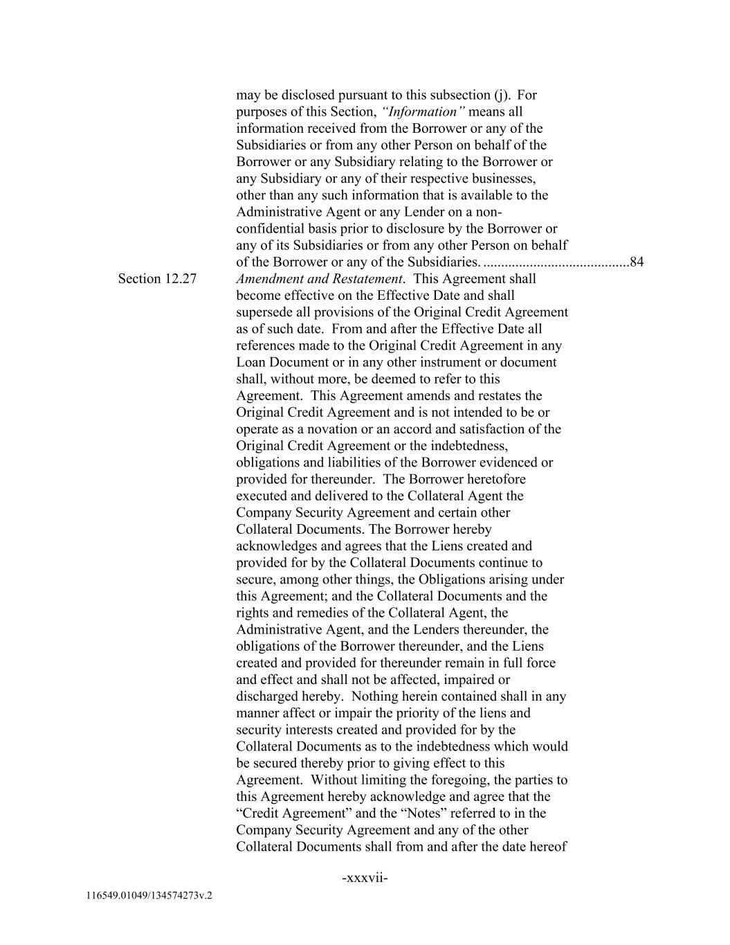 -xxxvii- 116549.01049/134574273v.2 may be disclosed pursuant to this subsection (j). For purposes of this Section, “Information” means all information received from the Borrower or any of the Subsidiaries or from any other Person on behalf of the Borrower or any Subsidiary relating to the Borrower or any Subsidiary or any of their respective businesses, other than any such information that is available to the Administrative Agent or any Lender on a non- confidential basis prior to disclosure by the Borrower or any of its Subsidiaries or from any other Person on behalf of the Borrower or any of the Subsidiaries. .........................................84  Section 12.27  Amendment and Restatement. This Agreement shall become effective on the Effective Date and shall supersede all provisions of the Original Credit Agreement as of such date. From and after the Effective Date all references made to the Original Credit Agreement in any Loan Document or in any other instrument or document shall, without more, be deemed to refer to this Agreement. This Agreement amends and restates the Original Credit Agreement and is not intended to be or operate as a novation or an accord and satisfaction of the Original Credit Agreement or the indebtedness, obligations and liabilities of the Borrower evidenced or provided for thereunder. The Borrower heretofore executed and delivered to the Collateral Agent the Company Security Agreement and certain other Collateral Documents. The Borrower hereby acknowledges and agrees that the Liens created and provided for by the Collateral Documents continue to secure, among other things, the Obligations arising under this Agreement; and the Collateral Documents and the rights and remedies of the Collateral Agent, the Administrative Agent, and the Lenders thereunder, the obligations of the Borrower thereunder, and the Liens created and provided for thereunder remain in full force and effect and shall not be affected, impaired or discharged hereby. Nothing herein contained shall in any manner affect or impair the priority of the liens and security interests created and provided for by the Collateral Documents as to the indebtedness which would be secured thereby prior to giving effect to this Agreement. Without limiting the foregoing, the parties to this Agreement hereby acknowledge and agree that the “Credit Agreement” and the “Notes” referred to in the Company Security Agreement and any of the other Collateral Documents shall from and after the date hereof