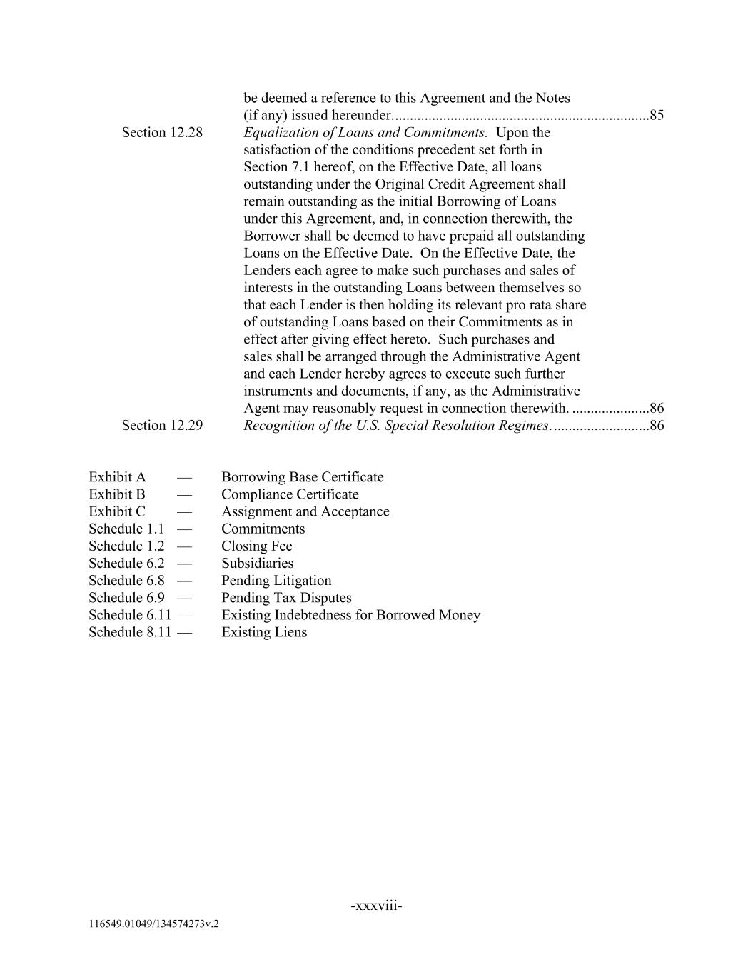 -xxxviii- 116549.01049/134574273v.2 be deemed a reference to this Agreement and the Notes (if any) issued hereunder. .....................................................................85  Section 12.28  Equalization of Loans and Commitments. Upon the satisfaction of the conditions precedent set forth in Section 7.1 hereof, on the Effective Date, all loans outstanding under the Original Credit Agreement shall remain outstanding as the initial Borrowing of Loans under this Agreement, and, in connection therewith, the Borrower shall be deemed to have prepaid all outstanding Loans on the Effective Date. On the Effective Date, the Lenders each agree to make such purchases and sales of interests in the outstanding Loans between themselves so that each Lender is then holding its relevant pro rata share of outstanding Loans based on their Commitments as in effect after giving effect hereto. Such purchases and sales shall be arranged through the Administrative Agent and each Lender hereby agrees to execute such further instruments and documents, if any, as the Administrative Agent may reasonably request in connection therewith. .....................86  Section 12.29  Recognition of the U.S. Special Resolution Regimes. ..........................86  Exhibit A — Borrowing Base Certificate Exhibit B — Compliance Certificate Exhibit C — Assignment and Acceptance Schedule 1.1 — Commitments Schedule 1.2 — Closing Fee Schedule 6.2 — Subsidiaries Schedule 6.8 — Pending Litigation Schedule 6.9 — Pending Tax Disputes Schedule 6.11 — Existing Indebtedness for Borrowed Money Schedule 8.11 — Existing Liens