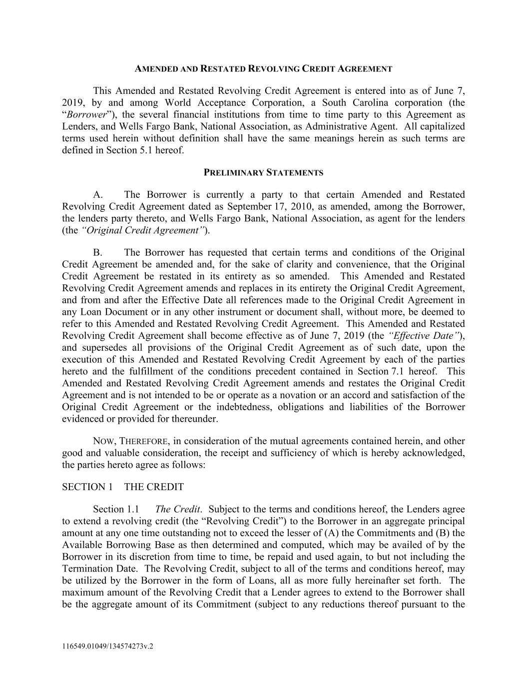 116549.01049/134574273v.2 AMENDED AND RESTATED REVOLVING CREDIT AGREEMENT This Amended and Restated Revolving Credit Agreement is entered into as of June 7, 2019, by and among World Acceptance Corporation, a South Carolina corporation (the “Borrower”), the several financial institutions from time to time party to this Agreement as Lenders, and Wells Fargo Bank, National Association, as Administrative Agent. All capitalized terms used herein without definition shall have the same meanings herein as such terms are defined in Section 5.1 hereof. PRELIMINARY STATEMENTS A. The Borrower is currently a party to that certain Amended and Restated Revolving Credit Agreement dated as September 17, 2010, as amended, among the Borrower, the lenders party thereto, and Wells Fargo Bank, National Association, as agent for the lenders (the “Original Credit Agreement”). B. The Borrower has requested that certain terms and conditions of the Original Credit Agreement be amended and, for the sake of clarity and convenience, that the Original Credit Agreement be restated in its entirety as so amended. This Amended and Restated Revolving Credit Agreement amends and replaces in its entirety the Original Credit Agreement, and from and after the Effective Date all references made to the Original Credit Agreement in any Loan Document or in any other instrument or document shall, without more, be deemed to refer to this Amended and Restated Revolving Credit Agreement. This Amended and Restated Revolving Credit Agreement shall become effective as of June 7, 2019 (the “Effective Date”), and supersedes all provisions of the Original Credit Agreement as of such date, upon the execution of this Amended and Restated Revolving Credit Agreement by each of the parties hereto and the fulfillment of the conditions precedent contained in Section 7.1 hereof. This Amended and Restated Revolving Credit Agreement amends and restates the Original Credit Agreement and is not intended to be or operate as a novation or an accord and satisfaction of the Original Credit Agreement or the indebtedness, obligations and liabilities of the Borrower evidenced or provided for thereunder. NOW, THEREFORE, in consideration of the mutual agreements contained herein, and other good and valuable consideration, the receipt and sufficiency of which is hereby acknowledged, the parties hereto agree as follows: SECTION 1 THE CREDIT Section 1.1 The Credit. Subject to the terms and conditions hereof, the Lenders agree to extend a revolving credit (the “Revolving Credit”) to the Borrower in an aggregate principal amount at any one time outstanding not to exceed the lesser of (A) the Commitments and (B) the Available Borrowing Base as then determined and computed, which may be availed of by the Borrower in its discretion from time to time, be repaid and used again, to but not including the Termination Date. The Revolving Credit, subject to all of the terms and conditions hereof, may be utilized by the Borrower in the form of Loans, all as more fully hereinafter set forth. The maximum amount of the Revolving Credit that a Lender agrees to extend to the Borrower shall be the aggregate amount of its Commitment (subject to any reductions thereof pursuant to the
