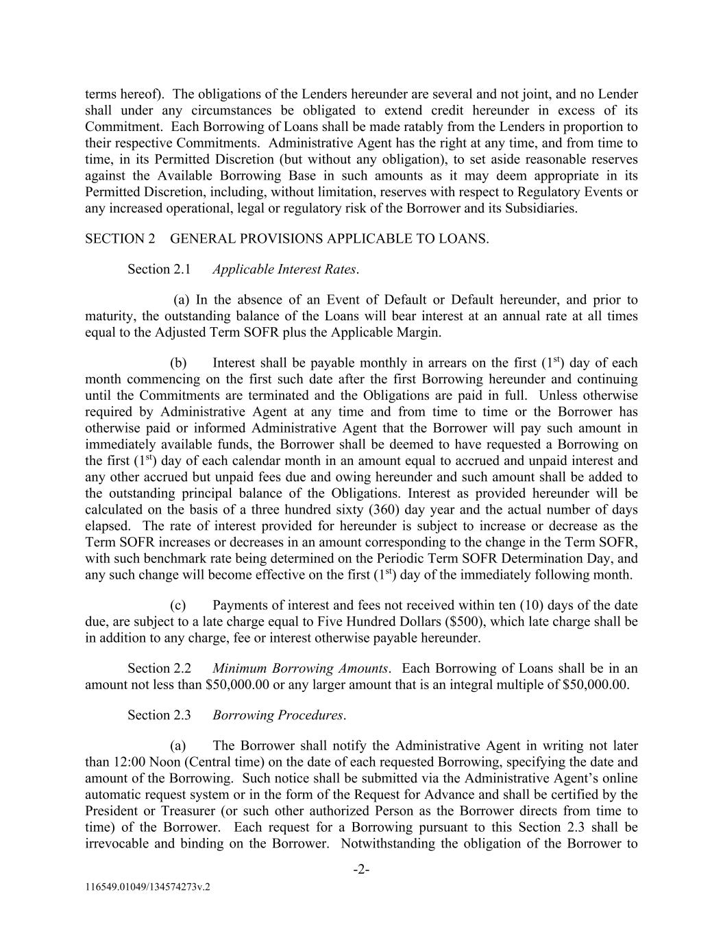 -2- 116549.01049/134574273v.2 terms hereof). The obligations of the Lenders hereunder are several and not joint, and no Lender shall under any circumstances be obligated to extend credit hereunder in excess of its Commitment. Each Borrowing of Loans shall be made ratably from the Lenders in proportion to their respective Commitments. Administrative Agent has the right at any time, and from time to time, in its Permitted Discretion (but without any obligation), to set aside reasonable reserves against the Available Borrowing Base in such amounts as it may deem appropriate in its Permitted Discretion, including, without limitation, reserves with respect to Regulatory Events or any increased operational, legal or regulatory risk of the Borrower and its Subsidiaries. SECTION 2 GENERAL PROVISIONS APPLICABLE TO LOANS. Section 2.1 Applicable Interest Rates. (a) In the absence of an Event of Default or Default hereunder, and prior to maturity, the outstanding balance of the Loans will bear interest at an annual rate at all times equal to the Adjusted Term SOFR plus the Applicable Margin. (b) Interest shall be payable monthly in arrears on the first (1st) day of each month commencing on the first such date after the first Borrowing hereunder and continuing until the Commitments are terminated and the Obligations are paid in full. Unless otherwise required by Administrative Agent at any time and from time to time or the Borrower has otherwise paid or informed Administrative Agent that the Borrower will pay such amount in immediately available funds, the Borrower shall be deemed to have requested a Borrowing on the first (1st) day of each calendar month in an amount equal to accrued and unpaid interest and any other accrued but unpaid fees due and owing hereunder and such amount shall be added to the outstanding principal balance of the Obligations. Interest as provided hereunder will be calculated on the basis of a three hundred sixty (360) day year and the actual number of days elapsed. The rate of interest provided for hereunder is subject to increase or decrease as the Term SOFR increases or decreases in an amount corresponding to the change in the Term SOFR, with such benchmark rate being determined on the Periodic Term SOFR Determination Day, and any such change will become effective on the first (1st) day of the immediately following month. (c) Payments of interest and fees not received within ten (10) days of the date due, are subject to a late charge equal to Five Hundred Dollars ($500), which late charge shall be in addition to any charge, fee or interest otherwise payable hereunder. Section 2.2 Minimum Borrowing Amounts. Each Borrowing of Loans shall be in an amount not less than $50,000.00 or any larger amount that is an integral multiple of $50,000.00. Section 2.3 Borrowing Procedures. (a) The Borrower shall notify the Administrative Agent in writing not later than 12:00 Noon (Central time) on the date of each requested Borrowing, specifying the date and amount of the Borrowing. Such notice shall be submitted via the Administrative Agent’s online automatic request system or in the form of the Request for Advance and shall be certified by the President or Treasurer (or such other authorized Person as the Borrower directs from time to time) of the Borrower. Each request for a Borrowing pursuant to this Section 2.3 shall be irrevocable and binding on the Borrower. Notwithstanding the obligation of the Borrower to