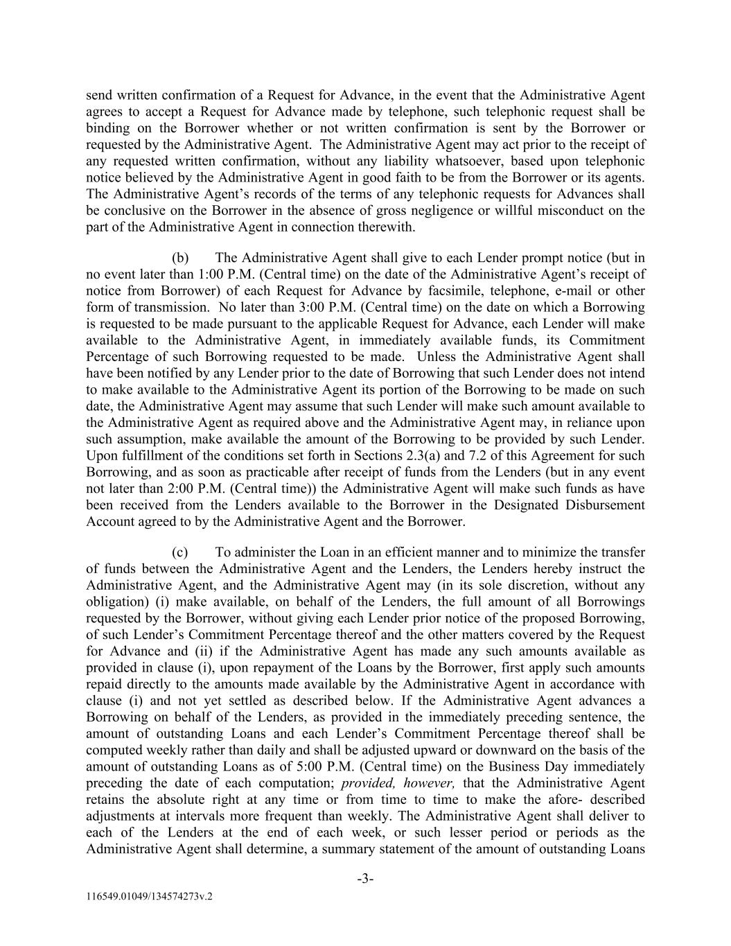-3- 116549.01049/134574273v.2 send written confirmation of a Request for Advance, in the event that the Administrative Agent agrees to accept a Request for Advance made by telephone, such telephonic request shall be binding on the Borrower whether or not written confirmation is sent by the Borrower or requested by the Administrative Agent. The Administrative Agent may act prior to the receipt of any requested written confirmation, without any liability whatsoever, based upon telephonic notice believed by the Administrative Agent in good faith to be from the Borrower or its agents. The Administrative Agent’s records of the terms of any telephonic requests for Advances shall be conclusive on the Borrower in the absence of gross negligence or willful misconduct on the part of the Administrative Agent in connection therewith. (b) The Administrative Agent shall give to each Lender prompt notice (but in no event later than 1:00 P.M. (Central time) on the date of the Administrative Agent’s receipt of notice from Borrower) of each Request for Advance by facsimile, telephone, e-mail or other form of transmission. No later than 3:00 P.M. (Central time) on the date on which a Borrowing is requested to be made pursuant to the applicable Request for Advance, each Lender will make available to the Administrative Agent, in immediately available funds, its Commitment Percentage of such Borrowing requested to be made. Unless the Administrative Agent shall have been notified by any Lender prior to the date of Borrowing that such Lender does not intend to make available to the Administrative Agent its portion of the Borrowing to be made on such date, the Administrative Agent may assume that such Lender will make such amount available to the Administrative Agent as required above and the Administrative Agent may, in reliance upon such assumption, make available the amount of the Borrowing to be provided by such Lender. Upon fulfillment of the conditions set forth in Sections 2.3(a) and 7.2 of this Agreement for such Borrowing, and as soon as practicable after receipt of funds from the Lenders (but in any event not later than 2:00 P.M. (Central time)) the Administrative Agent will make such funds as have been received from the Lenders available to the Borrower in the Designated Disbursement Account agreed to by the Administrative Agent and the Borrower. (c) To administer the Loan in an efficient manner and to minimize the transfer of funds between the Administrative Agent and the Lenders, the Lenders hereby instruct the Administrative Agent, and the Administrative Agent may (in its sole discretion, without any obligation) (i) make available, on behalf of the Lenders, the full amount of all Borrowings requested by the Borrower, without giving each Lender prior notice of the proposed Borrowing, of such Lender’s Commitment Percentage thereof and the other matters covered by the Request for Advance and (ii) if the Administrative Agent has made any such amounts available as provided in clause (i), upon repayment of the Loans by the Borrower, first apply such amounts repaid directly to the amounts made available by the Administrative Agent in accordance with clause (i) and not yet settled as described below. If the Administrative Agent advances a Borrowing on behalf of the Lenders, as provided in the immediately preceding sentence, the amount of outstanding Loans and each Lender’s Commitment Percentage thereof shall be computed weekly rather than daily and shall be adjusted upward or downward on the basis of the amount of outstanding Loans as of 5:00 P.M. (Central time) on the Business Day immediately preceding the date of each computation; provided, however, that the Administrative Agent retains the absolute right at any time or from time to time to make the afore- described adjustments at intervals more frequent than weekly. The Administrative Agent shall deliver to each of the Lenders at the end of each week, or such lesser period or periods as the Administrative Agent shall determine, a summary statement of the amount of outstanding Loans