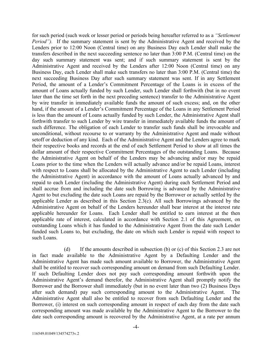 -4- 116549.01049/134574273v.2 for such period (such week or lesser period or periods being hereafter referred to as a “Settlement Period”). If the summary statement is sent by the Administrative Agent and received by the Lenders prior to 12:00 Noon (Central time) on any Business Day each Lender shall make the transfers described in the next succeeding sentence no later than 3:00 P.M. (Central time) on the day such summary statement was sent; and if such summary statement is sent by the Administrative Agent and received by the Lenders after 12:00 Noon (Central time) on any Business Day, each Lender shall make such transfers no later than 3:00 P.M. (Central time) the next succeeding Business Day after such summary statement was sent. If in any Settlement Period, the amount of a Lender’s Commitment Percentage of the Loans is in excess of the amount of Loans actually funded by such Lender, such Lender shall forthwith (but in no event later than the time set forth in the next preceding sentence) transfer to the Administrative Agent by wire transfer in immediately available funds the amount of such excess; and, on the other hand, if the amount of a Lender’s Commitment Percentage of the Loans in any Settlement Period is less than the amount of Loans actually funded by such Lender, the Administrative Agent shall forthwith transfer to such Lender by wire transfer in immediately available funds the amount of such difference. The obligation of each Lender to transfer such funds shall be irrevocable and unconditional, without recourse to or warranty by the Administrative Agent and made without setoff or deduction of any kind. Each of the Administrative Agent and the Lenders agree to mark their respective books and records at the end of each Settlement Period to show at all times the dollar amount of their respective Commitment Percentages of the outstanding Loans. Because the Administrative Agent on behalf of the Lenders may be advancing and/or may be repaid Loans prior to the time when the Lenders will actually advance and/or be repaid Loans, interest with respect to Loans shall be allocated by the Administrative Agent to each Lender (including the Administrative Agent) in accordance with the amount of Loans actually advanced by and repaid to each Lender (including the Administrative Agent) during each Settlement Period and shall accrue from and including the date such Borrowing is advanced by the Administrative Agent to but excluding the date such Loans are repaid by the Borrower or actually settled by the applicable Lender as described in this Section 2.3(c). All such Borrowings advanced by the Administrative Agent on behalf of the Lenders hereunder shall bear interest at the interest rate applicable hereunder for Loans. Each Lender shall be entitled to earn interest at the then applicable rate of interest, calculated in accordance with Section 2.1 of this Agreement, on outstanding Loans which it has funded to the Administrative Agent from the date such Lender funded such Loans to, but excluding, the date on which such Lender is repaid with respect to such Loans. (d) If the amounts described in subsection (b) or (c) of this Section 2.3 are not in fact made available to the Administrative Agent by a Defaulting Lender and the Administrative Agent has made such amount available to Borrower, the Administrative Agent shall be entitled to recover such corresponding amount on demand from such Defaulting Lender. If such Defaulting Lender does not pay such corresponding amount forthwith upon the Administrative Agent’s demand therefor, the Administrative Agent shall promptly notify the Borrower and the Borrower shall immediately (but in no event later than two (2) Business Days after such demand) pay such corresponding amount to the Administrative Agent. The Administrative Agent shall also be entitled to recover from such Defaulting Lender and the Borrower, (i) interest on such corresponding amount in respect of each day from the date such corresponding amount was made available by the Administrative Agent to the Borrower to the date such corresponding amount is recovered by the Administrative Agent, at a rate per annum