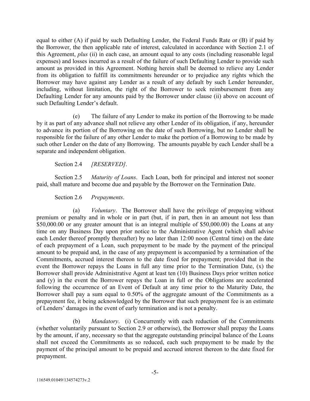 -5- 116549.01049/134574273v.2 equal to either (A) if paid by such Defaulting Lender, the Federal Funds Rate or (B) if paid by the Borrower, the then applicable rate of interest, calculated in accordance with Section 2.1 of this Agreement, plus (ii) in each case, an amount equal to any costs (including reasonable legal expenses) and losses incurred as a result of the failure of such Defaulting Lender to provide such amount as provided in this Agreement. Nothing herein shall be deemed to relieve any Lender from its obligation to fulfill its commitments hereunder or to prejudice any rights which the Borrower may have against any Lender as a result of any default by such Lender hereunder, including, without limitation, the right of the Borrower to seek reimbursement from any Defaulting Lender for any amounts paid by the Borrower under clause (ii) above on account of such Defaulting Lender’s default. (e) The failure of any Lender to make its portion of the Borrowing to be made by it as part of any advance shall not relieve any other Lender of its obligation, if any, hereunder to advance its portion of the Borrowing on the date of such Borrowing, but no Lender shall be responsible for the failure of any other Lender to make the portion of a Borrowing to be made by such other Lender on the date of any Borrowing. The amounts payable by each Lender shall be a separate and independent obligation. Section 2.4 [RESERVED]. Section 2.5 Maturity of Loans. Each Loan, both for principal and interest not sooner paid, shall mature and become due and payable by the Borrower on the Termination Date. Section 2.6 Prepayments. (a) Voluntary. The Borrower shall have the privilege of prepaying without premium or penalty and in whole or in part (but, if in part, then in an amount not less than $50,000.00 or any greater amount that is an integral multiple of $50,000.00) the Loans at any time on any Business Day upon prior notice to the Administrative Agent (which shall advise each Lender thereof promptly thereafter) by no later than 12:00 noon (Central time) on the date of each prepayment of a Loan, such prepayment to be made by the payment of the principal amount to be prepaid and, in the case of any prepayment is accompanied by a termination of the Commitments, accrued interest thereon to the date fixed for prepayment; provided that in the event the Borrower repays the Loans in full any time prior to the Termination Date, (x) the Borrower shall provide Administrative Agent at least ten (10) Business Days prior written notice and (y) in the event the Borrower repays the Loan in full or the Obligations are accelerated following the occurrence of an Event of Default at any time prior to the Maturity Date, the Borrower shall pay a sum equal to 0.50% of the aggregate amount of the Commitments as a prepayment fee, it being acknowledged by the Borrower that such prepayment fee is an estimate of Lenders’ damages in the event of early termination and is not a penalty. (b) Mandatory. (i) Concurrently with each reduction of the Commitments (whether voluntarily pursuant to Section 2.9 or otherwise), the Borrower shall prepay the Loans by the amount, if any, necessary so that the aggregate outstanding principal balance of the Loans shall not exceed the Commitments as so reduced, each such prepayment to be made by the payment of the principal amount to be prepaid and accrued interest thereon to the date fixed for prepayment.