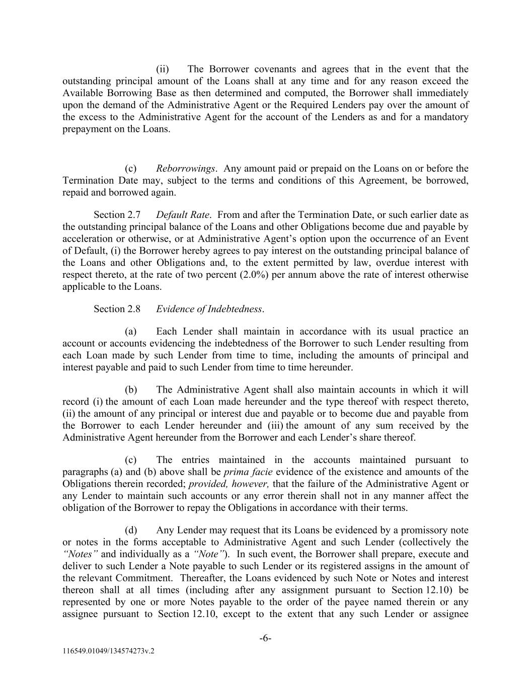 -6- 116549.01049/134574273v.2 (ii) The Borrower covenants and agrees that in the event that the outstanding principal amount of the Loans shall at any time and for any reason exceed the Available Borrowing Base as then determined and computed, the Borrower shall immediately upon the demand of the Administrative Agent or the Required Lenders pay over the amount of the excess to the Administrative Agent for the account of the Lenders as and for a mandatory prepayment on the Loans. (c) Reborrowings. Any amount paid or prepaid on the Loans on or before the Termination Date may, subject to the terms and conditions of this Agreement, be borrowed, repaid and borrowed again. Section 2.7 Default Rate. From and after the Termination Date, or such earlier date as the outstanding principal balance of the Loans and other Obligations become due and payable by acceleration or otherwise, or at Administrative Agent’s option upon the occurrence of an Event of Default, (i) the Borrower hereby agrees to pay interest on the outstanding principal balance of the Loans and other Obligations and, to the extent permitted by law, overdue interest with respect thereto, at the rate of two percent (2.0%) per annum above the rate of interest otherwise applicable to the Loans. Section 2.8 Evidence of Indebtedness. (a) Each Lender shall maintain in accordance with its usual practice an account or accounts evidencing the indebtedness of the Borrower to such Lender resulting from each Loan made by such Lender from time to time, including the amounts of principal and interest payable and paid to such Lender from time to time hereunder. (b) The Administrative Agent shall also maintain accounts in which it will record (i) the amount of each Loan made hereunder and the type thereof with respect thereto, (ii) the amount of any principal or interest due and payable or to become due and payable from the Borrower to each Lender hereunder and (iii) the amount of any sum received by the Administrative Agent hereunder from the Borrower and each Lender’s share thereof. (c) The entries maintained in the accounts maintained pursuant to paragraphs (a) and (b) above shall be prima facie evidence of the existence and amounts of the Obligations therein recorded; provided, however, that the failure of the Administrative Agent or any Lender to maintain such accounts or any error therein shall not in any manner affect the obligation of the Borrower to repay the Obligations in accordance with their terms. (d) Any Lender may request that its Loans be evidenced by a promissory note or notes in the forms acceptable to Administrative Agent and such Lender (collectively the “Notes” and individually as a “Note”). In such event, the Borrower shall prepare, execute and deliver to such Lender a Note payable to such Lender or its registered assigns in the amount of the relevant Commitment. Thereafter, the Loans evidenced by such Note or Notes and interest thereon shall at all times (including after any assignment pursuant to Section 12.10) be represented by one or more Notes payable to the order of the payee named therein or any assignee pursuant to Section 12.10, except to the extent that any such Lender or assignee