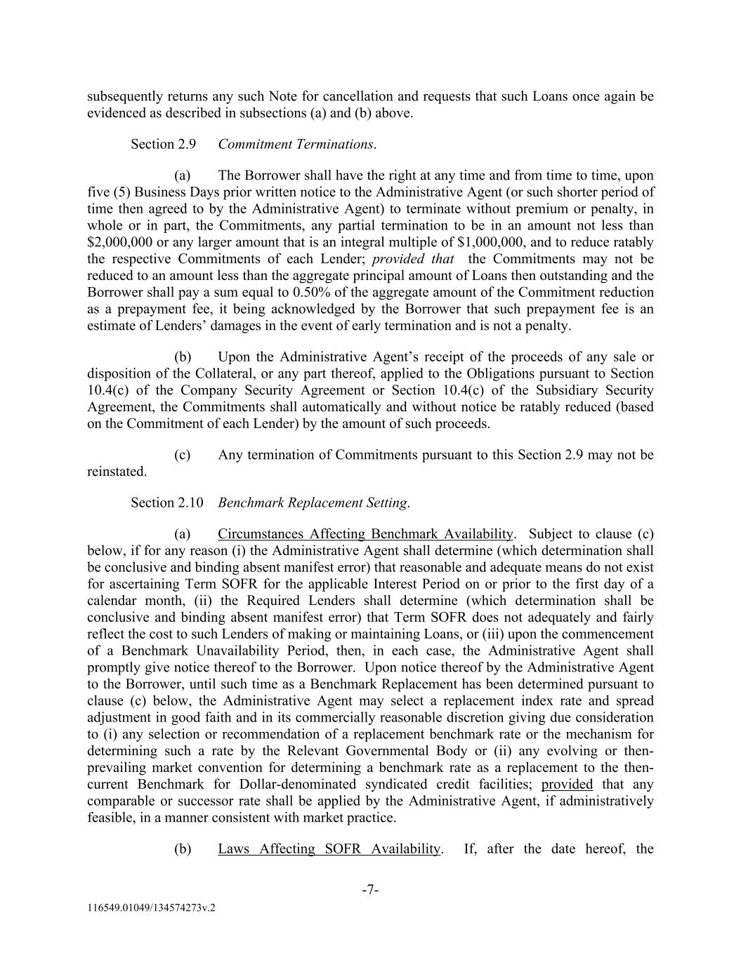-7- 116549.01049/134574273v.2 subsequently returns any such Note for cancellation and requests that such Loans once again be evidenced as described in subsections (a) and (b) above. Section 2.9 Commitment Terminations. (a) The Borrower shall have the right at any time and from time to time, upon five (5) Business Days prior written notice to the Administrative Agent (or such shorter period of time then agreed to by the Administrative Agent) to terminate without premium or penalty, in whole or in part, the Commitments, any partial termination to be in an amount not less than $2,000,000 or any larger amount that is an integral multiple of $1,000,000, and to reduce ratably the respective Commitments of each Lender; provided that the Commitments may not be reduced to an amount less than the aggregate principal amount of Loans then outstanding and the Borrower shall pay a sum equal to 0.50% of the aggregate amount of the Commitment reduction as a prepayment fee, it being acknowledged by the Borrower that such prepayment fee is an estimate of Lenders’ damages in the event of early termination and is not a penalty. (b) Upon the Administrative Agent’s receipt of the proceeds of any sale or disposition of the Collateral, or any part thereof, applied to the Obligations pursuant to Section 10.4(c) of the Company Security Agreement or Section 10.4(c) of the Subsidiary Security Agreement, the Commitments shall automatically and without notice be ratably reduced (based on the Commitment of each Lender) by the amount of such proceeds. (c) Any termination of Commitments pursuant to this Section 2.9 may not be reinstated. Section 2.10 Benchmark Replacement Setting. (a) Circumstances Affecting Benchmark Availability. Subject to clause (c) below, if for any reason (i) the Administrative Agent shall determine (which determination shall be conclusive and binding absent manifest error) that reasonable and adequate means do not exist for ascertaining Term SOFR for the applicable Interest Period on or prior to the first day of a calendar month, (ii) the Required Lenders shall determine (which determination shall be conclusive and binding absent manifest error) that Term SOFR does not adequately and fairly reflect the cost to such Lenders of making or maintaining Loans, or (iii) upon the commencement of a Benchmark Unavailability Period, then, in each case, the Administrative Agent shall promptly give notice thereof to the Borrower. Upon notice thereof by the Administrative Agent to the Borrower, until such time as a Benchmark Replacement has been determined pursuant to clause (c) below, the Administrative Agent may select a replacement index rate and spread adjustment in good faith and in its commercially reasonable discretion giving due consideration to (i) any selection or recommendation of a replacement benchmark rate or the mechanism for determining such a rate by the Relevant Governmental Body or (ii) any evolving or then- prevailing market convention for determining a benchmark rate as a replacement to the then- current Benchmark for Dollar-denominated syndicated credit facilities; provided that any comparable or successor rate shall be applied by the Administrative Agent, if administratively feasible, in a manner consistent with market practice. (b) Laws Affecting SOFR Availability. If, after the date hereof, the