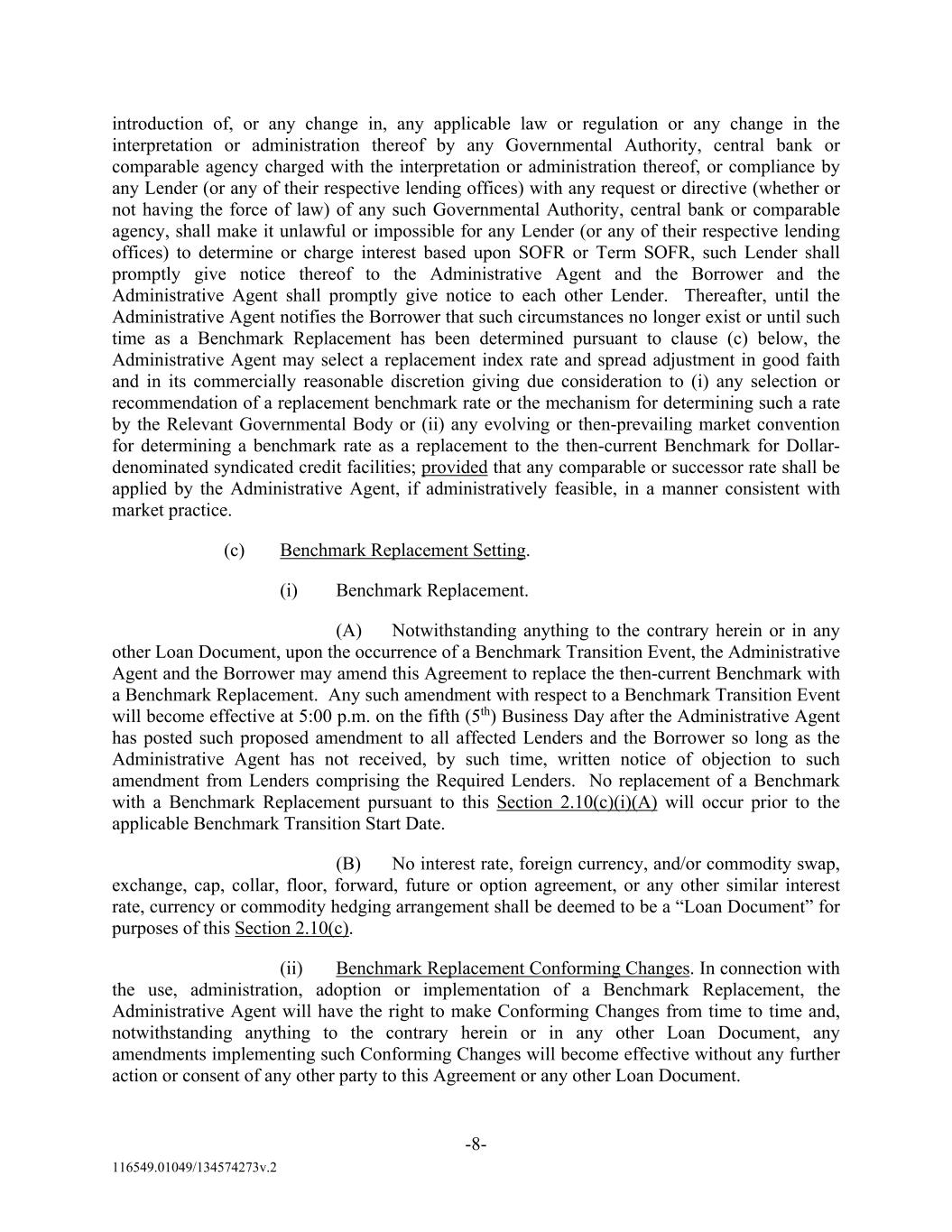 -8- 116549.01049/134574273v.2 introduction of, or any change in, any applicable law or regulation or any change in the interpretation or administration thereof by any Governmental Authority, central bank or comparable agency charged with the interpretation or administration thereof, or compliance by any Lender (or any of their respective lending offices) with any request or directive (whether or not having the force of law) of any such Governmental Authority, central bank or comparable agency, shall make it unlawful or impossible for any Lender (or any of their respective lending offices) to determine or charge interest based upon SOFR or Term SOFR, such Lender shall promptly give notice thereof to the Administrative Agent and the Borrower and the Administrative Agent shall promptly give notice to each other Lender. Thereafter, until the Administrative Agent notifies the Borrower that such circumstances no longer exist or until such time as a Benchmark Replacement has been determined pursuant to clause (c) below, the Administrative Agent may select a replacement index rate and spread adjustment in good faith and in its commercially reasonable discretion giving due consideration to (i) any selection or recommendation of a replacement benchmark rate or the mechanism for determining such a rate by the Relevant Governmental Body or (ii) any evolving or then-prevailing market convention for determining a benchmark rate as a replacement to the then-current Benchmark for Dollar- denominated syndicated credit facilities; provided that any comparable or successor rate shall be applied by the Administrative Agent, if administratively feasible, in a manner consistent with market practice. (c) Benchmark Replacement Setting. (i) Benchmark Replacement. (A) Notwithstanding anything to the contrary herein or in any other Loan Document, upon the occurrence of a Benchmark Transition Event, the Administrative Agent and the Borrower may amend this Agreement to replace the then-current Benchmark with a Benchmark Replacement. Any such amendment with respect to a Benchmark Transition Event will become effective at 5:00 p.m. on the fifth (5th) Business Day after the Administrative Agent has posted such proposed amendment to all affected Lenders and the Borrower so long as the Administrative Agent has not received, by such time, written notice of objection to such amendment from Lenders comprising the Required Lenders. No replacement of a Benchmark with a Benchmark Replacement pursuant to this Section 2.10(c)(i)(A) will occur prior to the applicable Benchmark Transition Start Date. (B) No interest rate, foreign currency, and/or commodity swap, exchange, cap, collar, floor, forward, future or option agreement, or any other similar interest rate, currency or commodity hedging arrangement shall be deemed to be a “Loan Document” for purposes of this Section 2.10(c). (ii) Benchmark Replacement Conforming Changes. In connection with the use, administration, adoption or implementation of a Benchmark Replacement, the Administrative Agent will have the right to make Conforming Changes from time to time and, notwithstanding anything to the contrary herein or in any other Loan Document, any amendments implementing such Conforming Changes will become effective without any further action or consent of any other party to this Agreement or any other Loan Document.