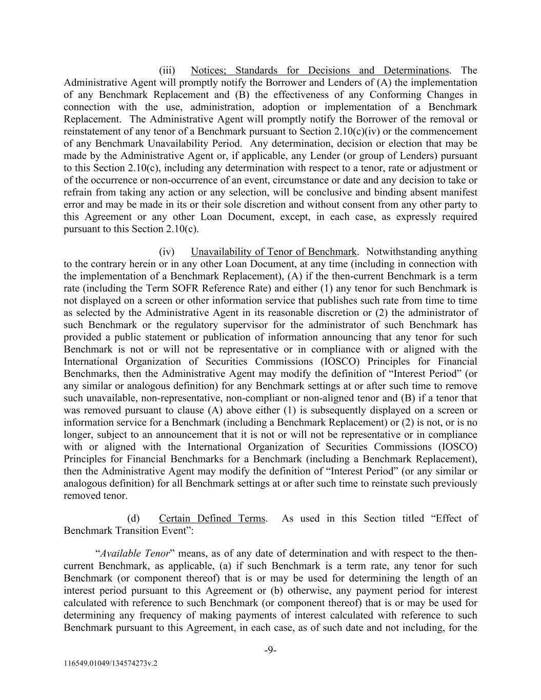 -9- 116549.01049/134574273v.2 (iii) Notices; Standards for Decisions and Determinations. The Administrative Agent will promptly notify the Borrower and Lenders of (A) the implementation of any Benchmark Replacement and (B) the effectiveness of any Conforming Changes in connection with the use, administration, adoption or implementation of a Benchmark Replacement. The Administrative Agent will promptly notify the Borrower of the removal or reinstatement of any tenor of a Benchmark pursuant to Section 2.10(c)(iv) or the commencement of any Benchmark Unavailability Period. Any determination, decision or election that may be made by the Administrative Agent or, if applicable, any Lender (or group of Lenders) pursuant to this Section 2.10(c), including any determination with respect to a tenor, rate or adjustment or of the occurrence or non-occurrence of an event, circumstance or date and any decision to take or refrain from taking any action or any selection, will be conclusive and binding absent manifest error and may be made in its or their sole discretion and without consent from any other party to this Agreement or any other Loan Document, except, in each case, as expressly required pursuant to this Section 2.10(c). (iv) Unavailability of Tenor of Benchmark. Notwithstanding anything to the contrary herein or in any other Loan Document, at any time (including in connection with the implementation of a Benchmark Replacement), (A) if the then-current Benchmark is a term rate (including the Term SOFR Reference Rate) and either (1) any tenor for such Benchmark is not displayed on a screen or other information service that publishes such rate from time to time as selected by the Administrative Agent in its reasonable discretion or (2) the administrator of such Benchmark or the regulatory supervisor for the administrator of such Benchmark has provided a public statement or publication of information announcing that any tenor for such Benchmark is not or will not be representative or in compliance with or aligned with the International Organization of Securities Commissions (IOSCO) Principles for Financial Benchmarks, then the Administrative Agent may modify the definition of “Interest Period” (or any similar or analogous definition) for any Benchmark settings at or after such time to remove such unavailable, non-representative, non-compliant or non-aligned tenor and (B) if a tenor that was removed pursuant to clause (A) above either (1) is subsequently displayed on a screen or information service for a Benchmark (including a Benchmark Replacement) or (2) is not, or is no longer, subject to an announcement that it is not or will not be representative or in compliance with or aligned with the International Organization of Securities Commissions (IOSCO) Principles for Financial Benchmarks for a Benchmark (including a Benchmark Replacement), then the Administrative Agent may modify the definition of “Interest Period” (or any similar or analogous definition) for all Benchmark settings at or after such time to reinstate such previously removed tenor. (d) Certain Defined Terms. As used in this Section titled “Effect of Benchmark Transition Event”: “Available Tenor” means, as of any date of determination and with respect to the then- current Benchmark, as applicable, (a) if such Benchmark is a term rate, any tenor for such Benchmark (or component thereof) that is or may be used for determining the length of an interest period pursuant to this Agreement or (b) otherwise, any payment period for interest calculated with reference to such Benchmark (or component thereof) that is or may be used for determining any frequency of making payments of interest calculated with reference to such Benchmark pursuant to this Agreement, in each case, as of such date and not including, for the