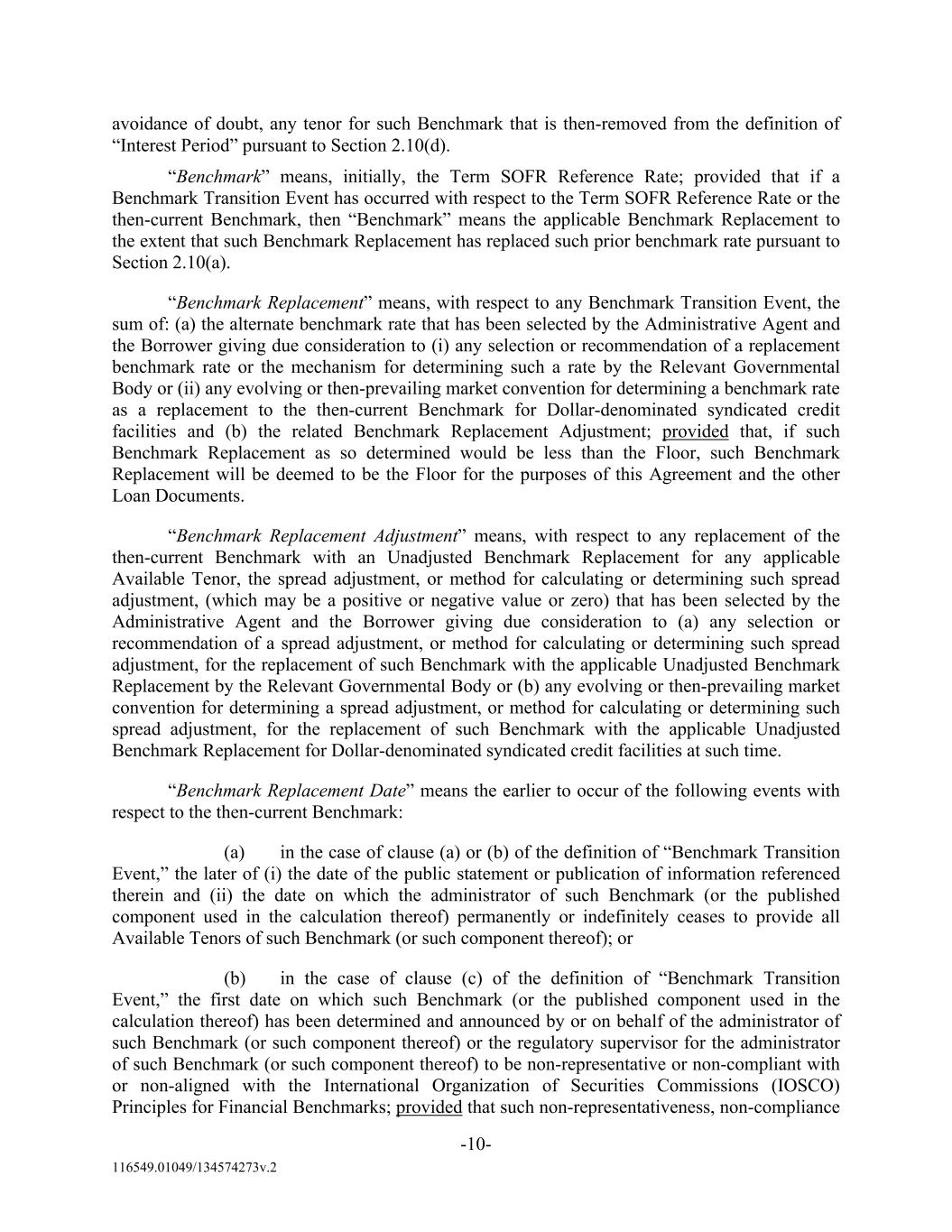-10- 116549.01049/134574273v.2 avoidance of doubt, any tenor for such Benchmark that is then-removed from the definition of “Interest Period” pursuant to Section 2.10(d). “Benchmark” means, initially, the Term SOFR Reference Rate; provided that if a Benchmark Transition Event has occurred with respect to the Term SOFR Reference Rate or the then-current Benchmark, then “Benchmark” means the applicable Benchmark Replacement to the extent that such Benchmark Replacement has replaced such prior benchmark rate pursuant to Section 2.10(a). “Benchmark Replacement” means, with respect to any Benchmark Transition Event, the sum of: (a) the alternate benchmark rate that has been selected by the Administrative Agent and the Borrower giving due consideration to (i) any selection or recommendation of a replacement benchmark rate or the mechanism for determining such a rate by the Relevant Governmental Body or (ii) any evolving or then-prevailing market convention for determining a benchmark rate as a replacement to the then-current Benchmark for Dollar-denominated syndicated credit facilities and (b) the related Benchmark Replacement Adjustment; provided that, if such Benchmark Replacement as so determined would be less than the Floor, such Benchmark Replacement will be deemed to be the Floor for the purposes of this Agreement and the other Loan Documents. “Benchmark Replacement Adjustment” means, with respect to any replacement of the then-current Benchmark with an Unadjusted Benchmark Replacement for any applicable Available Tenor, the spread adjustment, or method for calculating or determining such spread adjustment, (which may be a positive or negative value or zero) that has been selected by the Administrative Agent and the Borrower giving due consideration to (a) any selection or recommendation of a spread adjustment, or method for calculating or determining such spread adjustment, for the replacement of such Benchmark with the applicable Unadjusted Benchmark Replacement by the Relevant Governmental Body or (b) any evolving or then-prevailing market convention for determining a spread adjustment, or method for calculating or determining such spread adjustment, for the replacement of such Benchmark with the applicable Unadjusted Benchmark Replacement for Dollar-denominated syndicated credit facilities at such time. “Benchmark Replacement Date” means the earlier to occur of the following events with respect to the then-current Benchmark: (a) in the case of clause (a) or (b) of the definition of “Benchmark Transition Event,” the later of (i) the date of the public statement or publication of information referenced therein and (ii) the date on which the administrator of such Benchmark (or the published component used in the calculation thereof) permanently or indefinitely ceases to provide all Available Tenors of such Benchmark (or such component thereof); or (b) in the case of clause (c) of the definition of “Benchmark Transition Event,” the first date on which such Benchmark (or the published component used in the calculation thereof) has been determined and announced by or on behalf of the administrator of such Benchmark (or such component thereof) or the regulatory supervisor for the administrator of such Benchmark (or such component thereof) to be non-representative or non-compliant with or non-aligned with the International Organization of Securities Commissions (IOSCO) Principles for Financial Benchmarks; provided that such non-representativeness, non-compliance