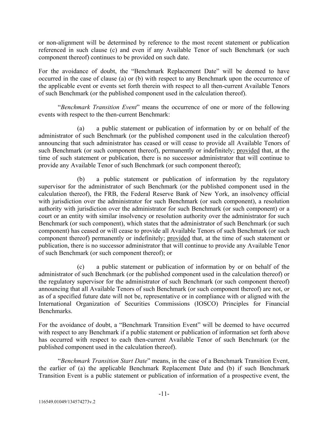 -11- 116549.01049/134574273v.2 or non-alignment will be determined by reference to the most recent statement or publication referenced in such clause (c) and even if any Available Tenor of such Benchmark (or such component thereof) continues to be provided on such date. For the avoidance of doubt, the “Benchmark Replacement Date” will be deemed to have occurred in the case of clause (a) or (b) with respect to any Benchmark upon the occurrence of the applicable event or events set forth therein with respect to all then-current Available Tenors of such Benchmark (or the published component used in the calculation thereof). “Benchmark Transition Event” means the occurrence of one or more of the following events with respect to the then-current Benchmark: (a) a public statement or publication of information by or on behalf of the administrator of such Benchmark (or the published component used in the calculation thereof) announcing that such administrator has ceased or will cease to provide all Available Tenors of such Benchmark (or such component thereof), permanently or indefinitely; provided that, at the time of such statement or publication, there is no successor administrator that will continue to provide any Available Tenor of such Benchmark (or such component thereof); (b) a public statement or publication of information by the regulatory supervisor for the administrator of such Benchmark (or the published component used in the calculation thereof), the FRB, the Federal Reserve Bank of New York, an insolvency official with jurisdiction over the administrator for such Benchmark (or such component), a resolution authority with jurisdiction over the administrator for such Benchmark (or such component) or a court or an entity with similar insolvency or resolution authority over the administrator for such Benchmark (or such component), which states that the administrator of such Benchmark (or such component) has ceased or will cease to provide all Available Tenors of such Benchmark (or such component thereof) permanently or indefinitely; provided that, at the time of such statement or publication, there is no successor administrator that will continue to provide any Available Tenor of such Benchmark (or such component thereof); or (c) a public statement or publication of information by or on behalf of the administrator of such Benchmark (or the published component used in the calculation thereof) or the regulatory supervisor for the administrator of such Benchmark (or such component thereof) announcing that all Available Tenors of such Benchmark (or such component thereof) are not, or as of a specified future date will not be, representative or in compliance with or aligned with the International Organization of Securities Commissions (IOSCO) Principles for Financial Benchmarks. For the avoidance of doubt, a “Benchmark Transition Event” will be deemed to have occurred with respect to any Benchmark if a public statement or publication of information set forth above has occurred with respect to each then-current Available Tenor of such Benchmark (or the published component used in the calculation thereof). “Benchmark Transition Start Date” means, in the case of a Benchmark Transition Event, the earlier of (a) the applicable Benchmark Replacement Date and (b) if such Benchmark Transition Event is a public statement or publication of information of a prospective event, the