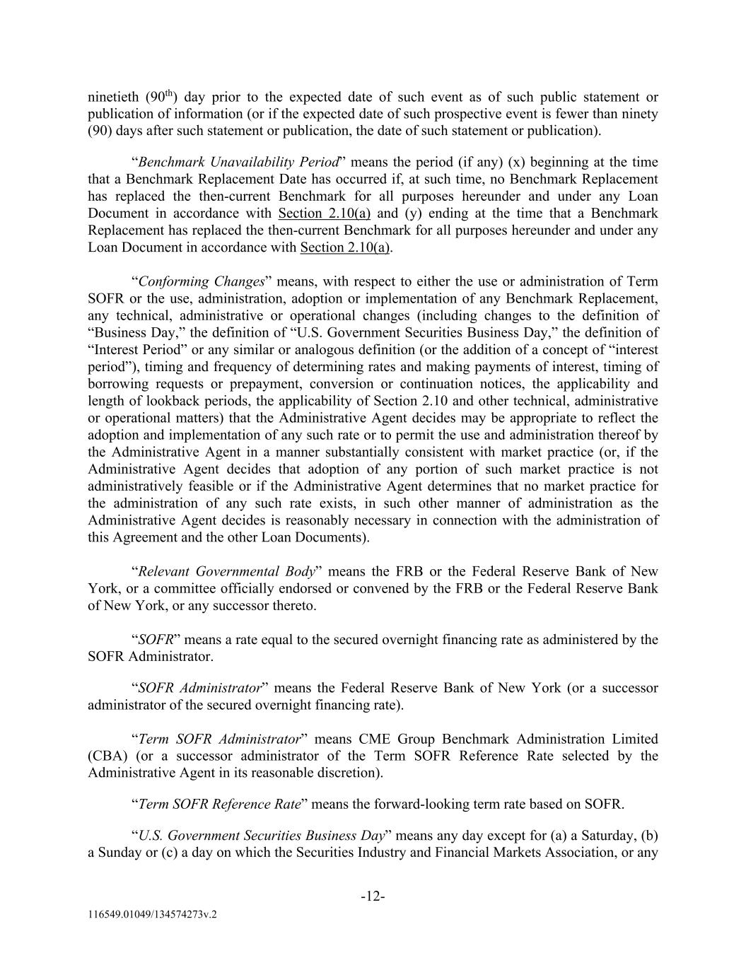 -12- 116549.01049/134574273v.2 ninetieth (90th) day prior to the expected date of such event as of such public statement or publication of information (or if the expected date of such prospective event is fewer than ninety (90) days after such statement or publication, the date of such statement or publication). “Benchmark Unavailability Period” means the period (if any) (x) beginning at the time that a Benchmark Replacement Date has occurred if, at such time, no Benchmark Replacement has replaced the then-current Benchmark for all purposes hereunder and under any Loan Document in accordance with Section 2.10(a) and (y) ending at the time that a Benchmark Replacement has replaced the then-current Benchmark for all purposes hereunder and under any Loan Document in accordance with Section 2.10(a). “Conforming Changes” means, with respect to either the use or administration of Term SOFR or the use, administration, adoption or implementation of any Benchmark Replacement, any technical, administrative or operational changes (including changes to the definition of “Business Day,” the definition of “U.S. Government Securities Business Day,” the definition of “Interest Period” or any similar or analogous definition (or the addition of a concept of “interest period”), timing and frequency of determining rates and making payments of interest, timing of borrowing requests or prepayment, conversion or continuation notices, the applicability and length of lookback periods, the applicability of Section 2.10 and other technical, administrative or operational matters) that the Administrative Agent decides may be appropriate to reflect the adoption and implementation of any such rate or to permit the use and administration thereof by the Administrative Agent in a manner substantially consistent with market practice (or, if the Administrative Agent decides that adoption of any portion of such market practice is not administratively feasible or if the Administrative Agent determines that no market practice for the administration of any such rate exists, in such other manner of administration as the Administrative Agent decides is reasonably necessary in connection with the administration of this Agreement and the other Loan Documents). “Relevant Governmental Body” means the FRB or the Federal Reserve Bank of New York, or a committee officially endorsed or convened by the FRB or the Federal Reserve Bank of New York, or any successor thereto. “SOFR” means a rate equal to the secured overnight financing rate as administered by the SOFR Administrator. “SOFR Administrator” means the Federal Reserve Bank of New York (or a successor administrator of the secured overnight financing rate). “Term SOFR Administrator” means CME Group Benchmark Administration Limited (CBA) (or a successor administrator of the Term SOFR Reference Rate selected by the Administrative Agent in its reasonable discretion). “Term SOFR Reference Rate” means the forward-looking term rate based on SOFR. “U.S. Government Securities Business Day” means any day except for (a) a Saturday, (b) a Sunday or (c) a day on which the Securities Industry and Financial Markets Association, or any