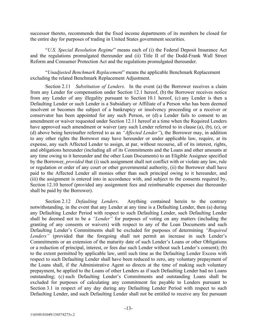 -13- 116549.01049/134574273v.2 successor thereto, recommends that the fixed income departments of its members be closed for the entire day for purposes of trading in United States government securities. “U.S. Special Resolution Regime” means each of (i) the Federal Deposit Insurance Act and the regulations promulgated thereunder and (ii) Title II of the Dodd-Frank Wall Street Reform and Consumer Protection Act and the regulations promulgated thereunder. “Unadjusted Benchmark Replacement” means the applicable Benchmark Replacement excluding the related Benchmark Replacement Adjustment. Section 2.11 Substitution of Lenders. In the event (a) the Borrower receives a claim from any Lender for compensation under Section 12.1 hereof, (b) the Borrower receives notice from any Lender of any illegality pursuant to Section 10.1 hereof, (c) any Lender is then a Defaulting Lender or such Lender is a Subsidiary or Affiliate of a Person who has been deemed insolvent or becomes the subject of a bankruptcy or insolvency proceeding or a receiver or conservator has been appointed for any such Person, or (d) a Lender fails to consent to an amendment or waiver requested under Section 12.11 hereof at a time when the Required Lenders have approved such amendment or waiver (any such Lender referred to in clause (a), (b), (c), or (d) above being hereinafter referred to as an “Affected Lender”), the Borrower may, in addition to any other rights the Borrower may have hereunder or under applicable law, require, at its expense, any such Affected Lender to assign, at par, without recourse, all of its interest, rights, and obligations hereunder (including all of its Commitments and the Loans and other amounts at any time owing to it hereunder and the other Loan Documents) to an Eligible Assignee specified by the Borrower, provided that (i) such assignment shall not conflict with or violate any law, rule or regulation or order of any court or other governmental authority, (ii) the Borrower shall have paid to the Affected Lender all monies other than such principal owing to it hereunder, and (iii) the assignment is entered into in accordance with, and subject to the consents required by, Section 12.10 hereof (provided any assignment fees and reimbursable expenses due thereunder shall be paid by the Borrower). Section 2.12 Defaulting Lenders. Anything contained herein to the contrary notwithstanding, in the event that any Lender at any time is a Defaulting Lender, then (a) during any Defaulting Lender Period with respect to such Defaulting Lender, such Defaulting Lender shall be deemed not to be a “Lender” for purposes of voting on any matters (including the granting of any consents or waivers) with respect to any of the Loan Documents and such Defaulting Lender’s Commitments shall be excluded for purposes of determining “Required Lenders” (provided that the foregoing shall not permit an increase in such Lender’s Commitments or an extension of the maturity date of such Lender’s Loans or other Obligations or a reduction of principal, interest, or fees due such Lender without such Lender’s consent); (b) to the extent permitted by applicable law, until such time as the Defaulting Lender Excess with respect to such Defaulting Lender shall have been reduced to zero, any voluntary prepayment of the Loans shall, if the Administrative Agent so directs at the time of making such voluntary prepayment, be applied to the Loans of other Lenders as if such Defaulting Lender had no Loans outstanding; (c) such Defaulting Lender’s Commitments and outstanding Loans shall be excluded for purposes of calculating any commitment fee payable to Lenders pursuant to Section 3.1 in respect of any day during any Defaulting Lender Period with respect to such Defaulting Lender, and such Defaulting Lender shall not be entitled to receive any fee pursuant