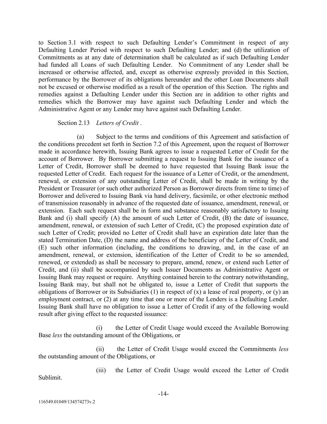 -14- 116549.01049/134574273v.2 to Section 3.1 with respect to such Defaulting Lender’s Commitment in respect of any Defaulting Lender Period with respect to such Defaulting Lender; and (d) the utilization of Commitments as at any date of determination shall be calculated as if such Defaulting Lender had funded all Loans of such Defaulting Lender. No Commitment of any Lender shall be increased or otherwise affected, and, except as otherwise expressly provided in this Section, performance by the Borrower of its obligations hereunder and the other Loan Documents shall not be excused or otherwise modified as a result of the operation of this Section. The rights and remedies against a Defaulting Lender under this Section are in addition to other rights and remedies which the Borrower may have against such Defaulting Lender and which the Administrative Agent or any Lender may have against such Defaulting Lender. Section 2.13 Letters of Credit . (a) Subject to the terms and conditions of this Agreement and satisfaction of the conditions precedent set forth in Section 7.2 of this Agreement, upon the request of Borrower made in accordance herewith, Issuing Bank agrees to issue a requested Letter of Credit for the account of Borrower. By Borrower submitting a request to Issuing Bank for the issuance of a Letter of Credit, Borrower shall be deemed to have requested that Issuing Bank issue the requested Letter of Credit. Each request for the issuance of a Letter of Credit, or the amendment, renewal, or extension of any outstanding Letter of Credit, shall be made in writing by the President or Treasurer (or such other authorized Person as Borrower directs from time to time) of Borrower and delivered to Issuing Bank via hand delivery, facsimile, or other electronic method of transmission reasonably in advance of the requested date of issuance, amendment, renewal, or extension. Each such request shall be in form and substance reasonably satisfactory to Issuing Bank and (i) shall specify (A) the amount of such Letter of Credit, (B) the date of issuance, amendment, renewal, or extension of such Letter of Credit, (C) the proposed expiration date of such Letter of Credit; provided no Letter of Credit shall have an expiration date later than the stated Termination Date, (D) the name and address of the beneficiary of the Letter of Credit, and (E) such other information (including, the conditions to drawing, and, in the case of an amendment, renewal, or extension, identification of the Letter of Credit to be so amended, renewed, or extended) as shall be necessary to prepare, amend, renew, or extend such Letter of Credit, and (ii) shall be accompanied by such Issuer Documents as Administrative Agent or Issuing Bank may request or require. Anything contained herein to the contrary notwithstanding, Issuing Bank may, but shall not be obligated to, issue a Letter of Credit that supports the obligations of Borrower or its Subsidiaries (1) in respect of (x) a lease of real property, or (y) an employment contract, or (2) at any time that one or more of the Lenders is a Defaulting Lender. Issuing Bank shall have no obligation to issue a Letter of Credit if any of the following would result after giving effect to the requested issuance: (i) the Letter of Credit Usage would exceed the Available Borrowing Base less the outstanding amount of the Obligations, or (ii) the Letter of Credit Usage would exceed the Commitments less the outstanding amount of the Obligations, or (iii) the Letter of Credit Usage would exceed the Letter of Credit Sublimit.
