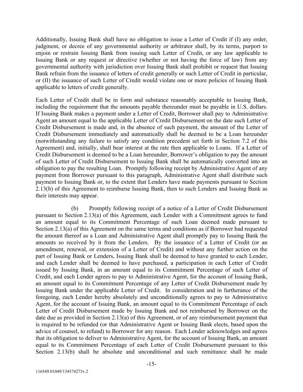 -15- 116549.01049/134574273v.2 Additionally, Issuing Bank shall have no obligation to issue a Letter of Credit if (I) any order, judgment, or decree of any governmental authority or arbitrator shall, by its terms, purport to enjoin or restrain Issuing Bank from issuing such Letter of Credit, or any law applicable to Issuing Bank or any request or directive (whether or not having the force of law) from any governmental authority with jurisdiction over Issuing Bank shall prohibit or request that Issuing Bank refrain from the issuance of letters of credit generally or such Letter of Credit in particular, or (II) the issuance of such Letter of Credit would violate one or more policies of Issuing Bank applicable to letters of credit generally. Each Letter of Credit shall be in form and substance reasonably acceptable to Issuing Bank, including the requirement that the amounts payable thereunder must be payable in U.S. dollars. If Issuing Bank makes a payment under a Letter of Credit, Borrower shall pay to Administrative Agent an amount equal to the applicable Letter of Credit Disbursement on the date such Letter of Credit Disbursement is made and, in the absence of such payment, the amount of the Letter of Credit Disbursement immediately and automatically shall be deemed to be a Loan hereunder (notwithstanding any failure to satisfy any condition precedent set forth in Section 7.2 of this Agreement) and, initially, shall bear interest at the rate then applicable to Loans. If a Letter of Credit Disbursement is deemed to be a Loan hereunder, Borrower’s obligation to pay the amount of such Letter of Credit Disbursement to Issuing Bank shall be automatically converted into an obligation to pay the resulting Loan. Promptly following receipt by Administrative Agent of any payment from Borrower pursuant to this paragraph, Administrative Agent shall distribute such payment to Issuing Bank or, to the extent that Lenders have made payments pursuant to Section 2.13(b) of this Agreement to reimburse Issuing Bank, then to such Lenders and Issuing Bank as their interests may appear. (b) Promptly following receipt of a notice of a Letter of Credit Disbursement pursuant to Section 2.13(a) of this Agreement, each Lender with a Commitment agrees to fund an amount equal to its Commitment Percentage of such Loan deemed made pursuant to Section 2.13(a) of this Agreement on the same terms and conditions as if Borrower had requested the amount thereof as a Loan and Administrative Agent shall promptly pay to Issuing Bank the amounts so received by it from the Lenders. By the issuance of a Letter of Credit (or an amendment, renewal, or extension of a Letter of Credit) and without any further action on the part of Issuing Bank or Lenders, Issuing Bank shall be deemed to have granted to each Lender, and each Lender shall be deemed to have purchased, a participation in each Letter of Credit issued by Issuing Bank, in an amount equal to its Commitment Percentage of such Letter of Credit, and each Lender agrees to pay to Administrative Agent, for the account of Issuing Bank, an amount equal to its Commitment Percentage of any Letter of Credit Disbursement made by Issuing Bank under the applicable Letter of Credit. In consideration and in furtherance of the foregoing, each Lender hereby absolutely and unconditionally agrees to pay to Administrative Agent, for the account of Issuing Bank, an amount equal to its Commitment Percentage of each Letter of Credit Disbursement made by Issuing Bank and not reimbursed by Borrower on the date due as provided in Section 2.13(a) of this Agreement, or of any reimbursement payment that is required to be refunded (or that Administrative Agent or Issuing Bank elects, based upon the advice of counsel, to refund) to Borrower for any reason. Each Lender acknowledges and agrees that its obligation to deliver to Administrative Agent, for the account of Issuing Bank, an amount equal to its Commitment Percentage of each Letter of Credit Disbursement pursuant to this Section 2.13(b) shall be absolute and unconditional and such remittance shall be made