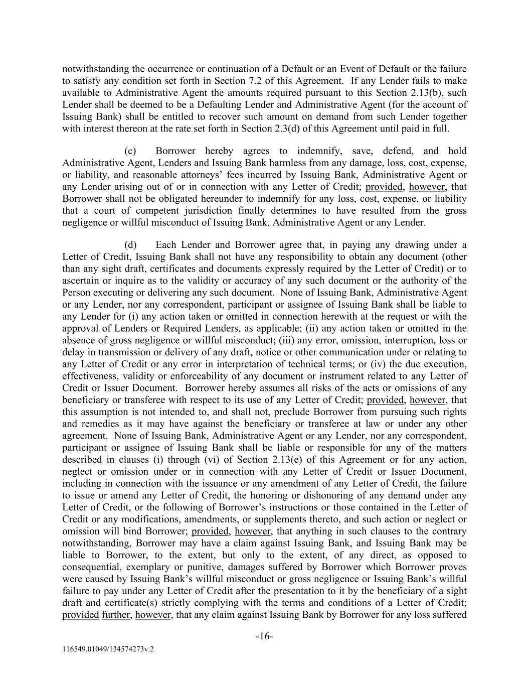 -16- 116549.01049/134574273v.2 notwithstanding the occurrence or continuation of a Default or an Event of Default or the failure to satisfy any condition set forth in Section 7.2 of this Agreement. If any Lender fails to make available to Administrative Agent the amounts required pursuant to this Section 2.13(b), such Lender shall be deemed to be a Defaulting Lender and Administrative Agent (for the account of Issuing Bank) shall be entitled to recover such amount on demand from such Lender together with interest thereon at the rate set forth in Section 2.3(d) of this Agreement until paid in full. (c) Borrower hereby agrees to indemnify, save, defend, and hold Administrative Agent, Lenders and Issuing Bank harmless from any damage, loss, cost, expense, or liability, and reasonable attorneys’ fees incurred by Issuing Bank, Administrative Agent or any Lender arising out of or in connection with any Letter of Credit; provided, however, that Borrower shall not be obligated hereunder to indemnify for any loss, cost, expense, or liability that a court of competent jurisdiction finally determines to have resulted from the gross negligence or willful misconduct of Issuing Bank, Administrative Agent or any Lender. (d) Each Lender and Borrower agree that, in paying any drawing under a Letter of Credit, Issuing Bank shall not have any responsibility to obtain any document (other than any sight draft, certificates and documents expressly required by the Letter of Credit) or to ascertain or inquire as to the validity or accuracy of any such document or the authority of the Person executing or delivering any such document. None of Issuing Bank, Administrative Agent or any Lender, nor any correspondent, participant or assignee of Issuing Bank shall be liable to any Lender for (i) any action taken or omitted in connection herewith at the request or with the approval of Lenders or Required Lenders, as applicable; (ii) any action taken or omitted in the absence of gross negligence or willful misconduct; (iii) any error, omission, interruption, loss or delay in transmission or delivery of any draft, notice or other communication under or relating to any Letter of Credit or any error in interpretation of technical terms; or (iv) the due execution, effectiveness, validity or enforceability of any document or instrument related to any Letter of Credit or Issuer Document. Borrower hereby assumes all risks of the acts or omissions of any beneficiary or transferee with respect to its use of any Letter of Credit; provided, however, that this assumption is not intended to, and shall not, preclude Borrower from pursuing such rights and remedies as it may have against the beneficiary or transferee at law or under any other agreement. None of Issuing Bank, Administrative Agent or any Lender, nor any correspondent, participant or assignee of Issuing Bank shall be liable or responsible for any of the matters described in clauses (i) through (vi) of Section 2.13(e) of this Agreement or for any action, neglect or omission under or in connection with any Letter of Credit or Issuer Document, including in connection with the issuance or any amendment of any Letter of Credit, the failure to issue or amend any Letter of Credit, the honoring or dishonoring of any demand under any Letter of Credit, or the following of Borrower’s instructions or those contained in the Letter of Credit or any modifications, amendments, or supplements thereto, and such action or neglect or omission will bind Borrower; provided, however, that anything in such clauses to the contrary notwithstanding, Borrower may have a claim against Issuing Bank, and Issuing Bank may be liable to Borrower, to the extent, but only to the extent, of any direct, as opposed to consequential, exemplary or punitive, damages suffered by Borrower which Borrower proves were caused by Issuing Bank’s willful misconduct or gross negligence or Issuing Bank’s willful failure to pay under any Letter of Credit after the presentation to it by the beneficiary of a sight draft and certificate(s) strictly complying with the terms and conditions of a Letter of Credit; provided further, however, that any claim against Issuing Bank by Borrower for any loss suffered
