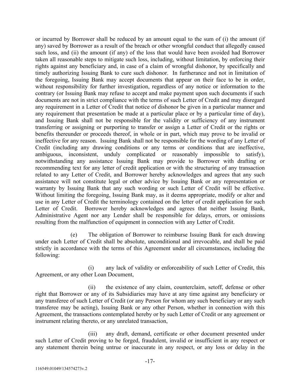 -17- 116549.01049/134574273v.2 or incurred by Borrower shall be reduced by an amount equal to the sum of (i) the amount (if any) saved by Borrower as a result of the breach or other wrongful conduct that allegedly caused such loss, and (ii) the amount (if any) of the loss that would have been avoided had Borrower taken all reasonable steps to mitigate such loss, including, without limitation, by enforcing their rights against any beneficiary and, in case of a claim of wrongful dishonor, by specifically and timely authorizing Issuing Bank to cure such dishonor. In furtherance and not in limitation of the foregoing, Issuing Bank may accept documents that appear on their face to be in order, without responsibility for further investigation, regardless of any notice or information to the contrary (or Issuing Bank may refuse to accept and make payment upon such documents if such documents are not in strict compliance with the terms of such Letter of Credit and may disregard any requirement in a Letter of Credit that notice of dishonor be given in a particular manner and any requirement that presentation be made at a particular place or by a particular time of day), and Issuing Bank shall not be responsible for the validity or sufficiency of any instrument transferring or assigning or purporting to transfer or assign a Letter of Credit or the rights or benefits thereunder or proceeds thereof, in whole or in part, which may prove to be invalid or ineffective for any reason. Issuing Bank shall not be responsible for the wording of any Letter of Credit (including any drawing conditions or any terms or conditions that are ineffective, ambiguous, inconsistent, unduly complicated or reasonably impossible to satisfy), notwithstanding any assistance Issuing Bank may provide to Borrower with drafting or recommending text for any letter of credit application or with the structuring of any transaction related to any Letter of Credit, and Borrower hereby acknowledges and agrees that any such assistance will not constitute legal or other advice by Issuing Bank or any representation or warranty by Issuing Bank that any such wording or such Letter of Credit will be effective. Without limiting the foregoing, Issuing Bank may, as it deems appropriate, modify or alter and use in any Letter of Credit the terminology contained on the letter of credit application for such Letter of Credit. Borrower hereby acknowledges and agrees that neither Issuing Bank, Administrative Agent nor any Lender shall be responsible for delays, errors, or omissions resulting from the malfunction of equipment in connection with any Letter of Credit. (e) The obligation of Borrower to reimburse Issuing Bank for each drawing under each Letter of Credit shall be absolute, unconditional and irrevocable, and shall be paid strictly in accordance with the terms of this Agreement under all circumstances, including the following: (i) any lack of validity or enforceability of such Letter of Credit, this Agreement, or any other Loan Document, (ii) the existence of any claim, counterclaim, setoff, defense or other right that Borrower or any of its Subsidiaries may have at any time against any beneficiary or any transferee of such Letter of Credit (or any Person for whom any such beneficiary or any such transferee may be acting), Issuing Bank or any other Person, whether in connection with this Agreement, the transactions contemplated hereby or by such Letter of Credit or any agreement or instrument relating thereto, or any unrelated transaction, (iii) any draft, demand, certificate or other document presented under such Letter of Credit proving to be forged, fraudulent, invalid or insufficient in any respect or any statement therein being untrue or inaccurate in any respect, or any loss or delay in the