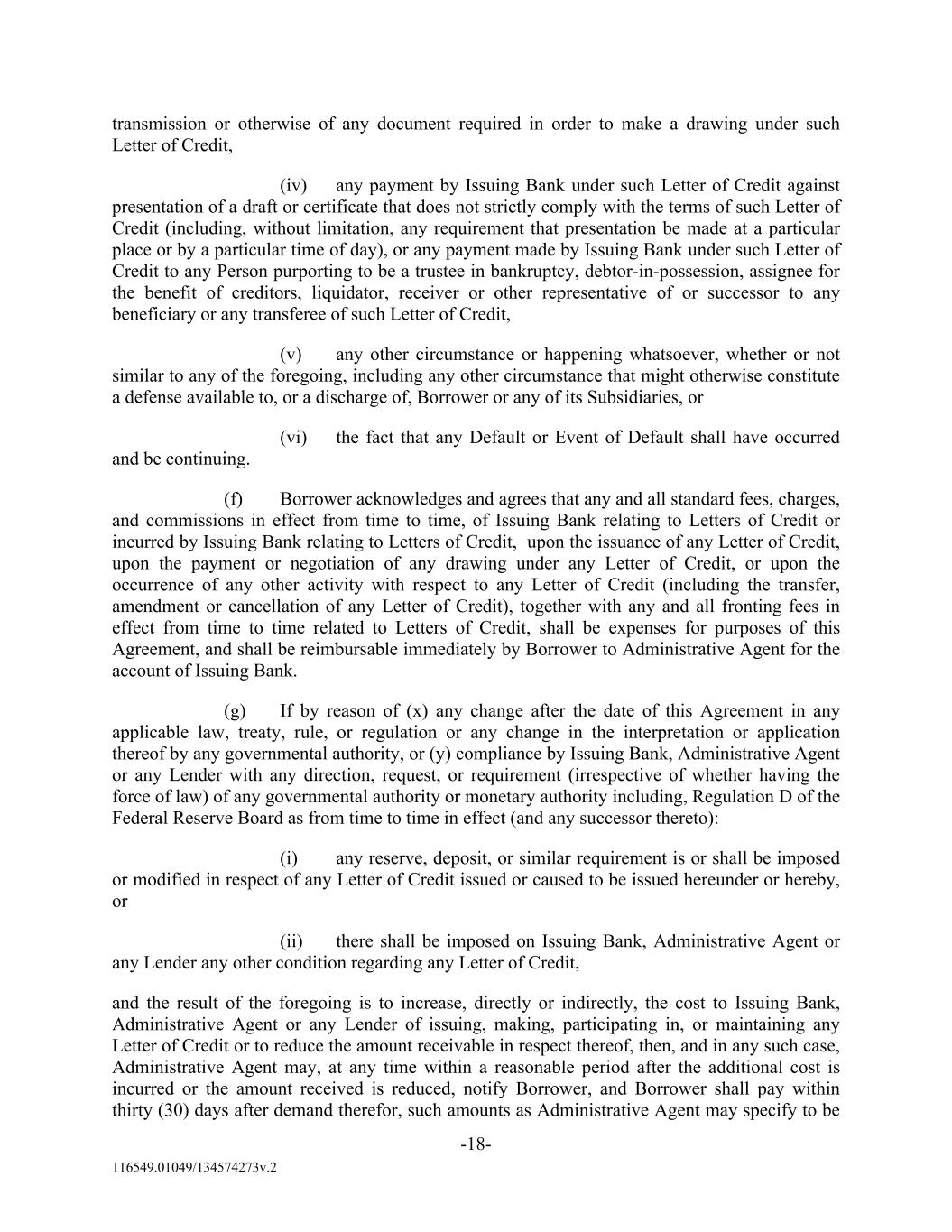 -18- 116549.01049/134574273v.2 transmission or otherwise of any document required in order to make a drawing under such Letter of Credit, (iv) any payment by Issuing Bank under such Letter of Credit against presentation of a draft or certificate that does not strictly comply with the terms of such Letter of Credit (including, without limitation, any requirement that presentation be made at a particular place or by a particular time of day), or any payment made by Issuing Bank under such Letter of Credit to any Person purporting to be a trustee in bankruptcy, debtor-in-possession, assignee for the benefit of creditors, liquidator, receiver or other representative of or successor to any beneficiary or any transferee of such Letter of Credit, (v) any other circumstance or happening whatsoever, whether or not similar to any of the foregoing, including any other circumstance that might otherwise constitute a defense available to, or a discharge of, Borrower or any of its Subsidiaries, or (vi) the fact that any Default or Event of Default shall have occurred and be continuing. (f) Borrower acknowledges and agrees that any and all standard fees, charges, and commissions in effect from time to time, of Issuing Bank relating to Letters of Credit or incurred by Issuing Bank relating to Letters of Credit, upon the issuance of any Letter of Credit, upon the payment or negotiation of any drawing under any Letter of Credit, or upon the occurrence of any other activity with respect to any Letter of Credit (including the transfer, amendment or cancellation of any Letter of Credit), together with any and all fronting fees in effect from time to time related to Letters of Credit, shall be expenses for purposes of this Agreement, and shall be reimbursable immediately by Borrower to Administrative Agent for the account of Issuing Bank. (g) If by reason of (x) any change after the date of this Agreement in any applicable law, treaty, rule, or regulation or any change in the interpretation or application thereof by any governmental authority, or (y) compliance by Issuing Bank, Administrative Agent or any Lender with any direction, request, or requirement (irrespective of whether having the force of law) of any governmental authority or monetary authority including, Regulation D of the Federal Reserve Board as from time to time in effect (and any successor thereto): (i) any reserve, deposit, or similar requirement is or shall be imposed or modified in respect of any Letter of Credit issued or caused to be issued hereunder or hereby, or (ii) there shall be imposed on Issuing Bank, Administrative Agent or any Lender any other condition regarding any Letter of Credit, and the result of the foregoing is to increase, directly or indirectly, the cost to Issuing Bank, Administrative Agent or any Lender of issuing, making, participating in, or maintaining any Letter of Credit or to reduce the amount receivable in respect thereof, then, and in any such case, Administrative Agent may, at any time within a reasonable period after the additional cost is incurred or the amount received is reduced, notify Borrower, and Borrower shall pay within thirty (30) days after demand therefor, such amounts as Administrative Agent may specify to be