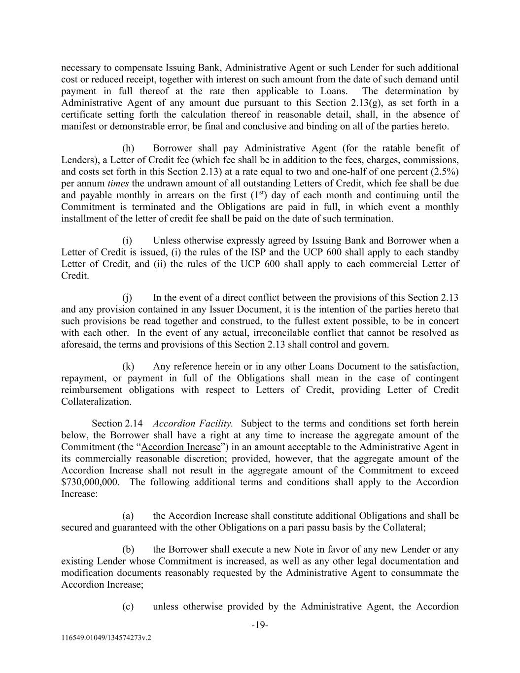-19- 116549.01049/134574273v.2 necessary to compensate Issuing Bank, Administrative Agent or such Lender for such additional cost or reduced receipt, together with interest on such amount from the date of such demand until payment in full thereof at the rate then applicable to Loans. The determination by Administrative Agent of any amount due pursuant to this Section 2.13(g), as set forth in a certificate setting forth the calculation thereof in reasonable detail, shall, in the absence of manifest or demonstrable error, be final and conclusive and binding on all of the parties hereto. (h) Borrower shall pay Administrative Agent (for the ratable benefit of Lenders), a Letter of Credit fee (which fee shall be in addition to the fees, charges, commissions, and costs set forth in this Section 2.13) at a rate equal to two and one-half of one percent (2.5%) per annum times the undrawn amount of all outstanding Letters of Credit, which fee shall be due and payable monthly in arrears on the first (1st) day of each month and continuing until the Commitment is terminated and the Obligations are paid in full, in which event a monthly installment of the letter of credit fee shall be paid on the date of such termination. (i) Unless otherwise expressly agreed by Issuing Bank and Borrower when a Letter of Credit is issued, (i) the rules of the ISP and the UCP 600 shall apply to each standby Letter of Credit, and (ii) the rules of the UCP 600 shall apply to each commercial Letter of Credit. (j) In the event of a direct conflict between the provisions of this Section 2.13 and any provision contained in any Issuer Document, it is the intention of the parties hereto that such provisions be read together and construed, to the fullest extent possible, to be in concert with each other. In the event of any actual, irreconcilable conflict that cannot be resolved as aforesaid, the terms and provisions of this Section 2.13 shall control and govern. (k) Any reference herein or in any other Loans Document to the satisfaction, repayment, or payment in full of the Obligations shall mean in the case of contingent reimbursement obligations with respect to Letters of Credit, providing Letter of Credit Collateralization. Section 2.14 Accordion Facility. Subject to the terms and conditions set forth herein below, the Borrower shall have a right at any time to increase the aggregate amount of the Commitment (the “Accordion Increase”) in an amount acceptable to the Administrative Agent in its commercially reasonable discretion; provided, however, that the aggregate amount of the Accordion Increase shall not result in the aggregate amount of the Commitment to exceed $730,000,000. The following additional terms and conditions shall apply to the Accordion Increase: (a) the Accordion Increase shall constitute additional Obligations and shall be secured and guaranteed with the other Obligations on a pari passu basis by the Collateral; (b) the Borrower shall execute a new Note in favor of any new Lender or any existing Lender whose Commitment is increased, as well as any other legal documentation and modification documents reasonably requested by the Administrative Agent to consummate the Accordion Increase; (c) unless otherwise provided by the Administrative Agent, the Accordion