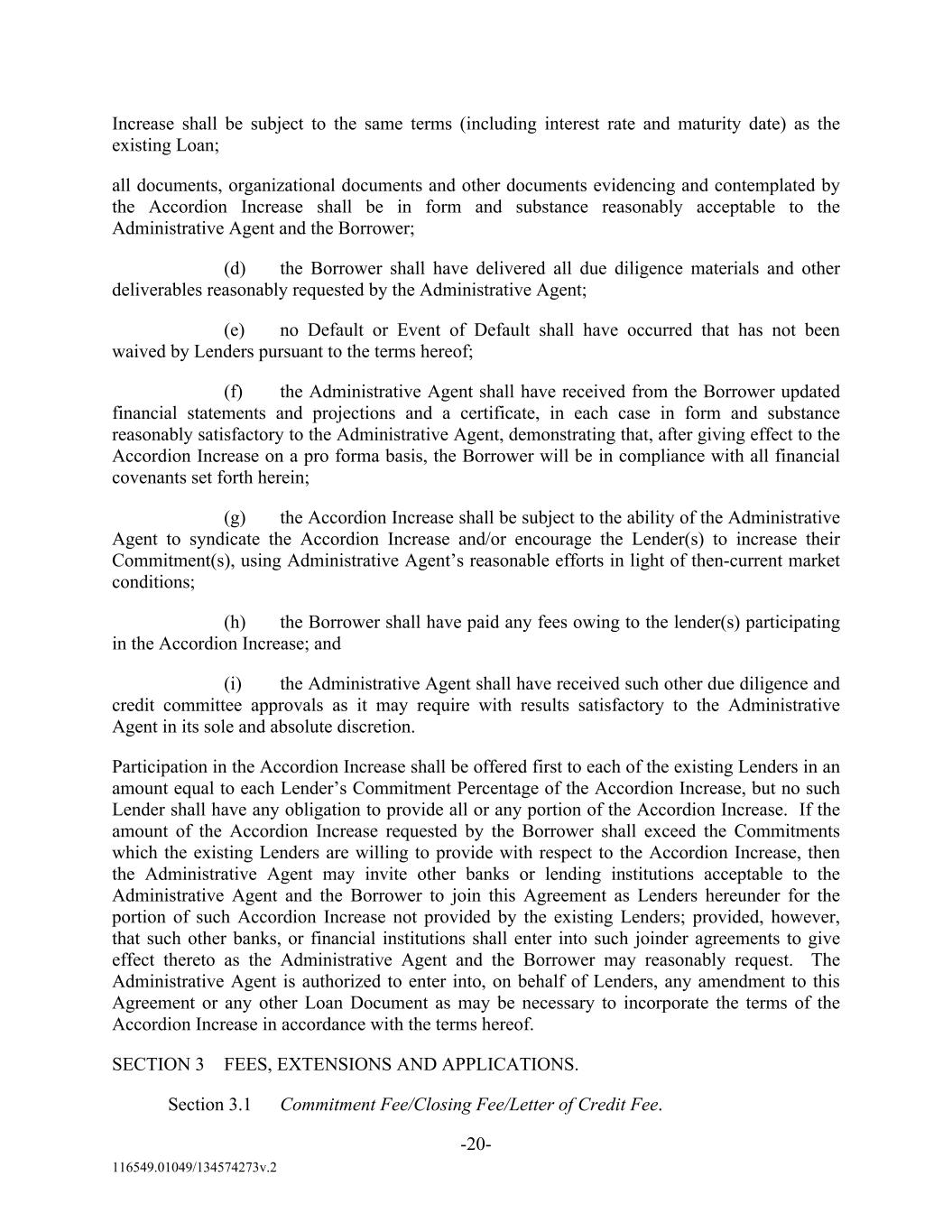 -20- 116549.01049/134574273v.2 Increase shall be subject to the same terms (including interest rate and maturity date) as the existing Loan; all documents, organizational documents and other documents evidencing and contemplated by the Accordion Increase shall be in form and substance reasonably acceptable to the Administrative Agent and the Borrower; (d) the Borrower shall have delivered all due diligence materials and other deliverables reasonably requested by the Administrative Agent; (e) no Default or Event of Default shall have occurred that has not been waived by Lenders pursuant to the terms hereof; (f) the Administrative Agent shall have received from the Borrower updated financial statements and projections and a certificate, in each case in form and substance reasonably satisfactory to the Administrative Agent, demonstrating that, after giving effect to the Accordion Increase on a pro forma basis, the Borrower will be in compliance with all financial covenants set forth herein; (g) the Accordion Increase shall be subject to the ability of the Administrative Agent to syndicate the Accordion Increase and/or encourage the Lender(s) to increase their Commitment(s), using Administrative Agent’s reasonable efforts in light of then-current market conditions; (h) the Borrower shall have paid any fees owing to the lender(s) participating in the Accordion Increase; and (i) the Administrative Agent shall have received such other due diligence and credit committee approvals as it may require with results satisfactory to the Administrative Agent in its sole and absolute discretion. Participation in the Accordion Increase shall be offered first to each of the existing Lenders in an amount equal to each Lender’s Commitment Percentage of the Accordion Increase, but no such Lender shall have any obligation to provide all or any portion of the Accordion Increase. If the amount of the Accordion Increase requested by the Borrower shall exceed the Commitments which the existing Lenders are willing to provide with respect to the Accordion Increase, then the Administrative Agent may invite other banks or lending institutions acceptable to the Administrative Agent and the Borrower to join this Agreement as Lenders hereunder for the portion of such Accordion Increase not provided by the existing Lenders; provided, however, that such other banks, or financial institutions shall enter into such joinder agreements to give effect thereto as the Administrative Agent and the Borrower may reasonably request. The Administrative Agent is authorized to enter into, on behalf of Lenders, any amendment to this Agreement or any other Loan Document as may be necessary to incorporate the terms of the Accordion Increase in accordance with the terms hereof. SECTION 3 FEES, EXTENSIONS AND APPLICATIONS. Section 3.1 Commitment Fee/Closing Fee/Letter of Credit Fee.