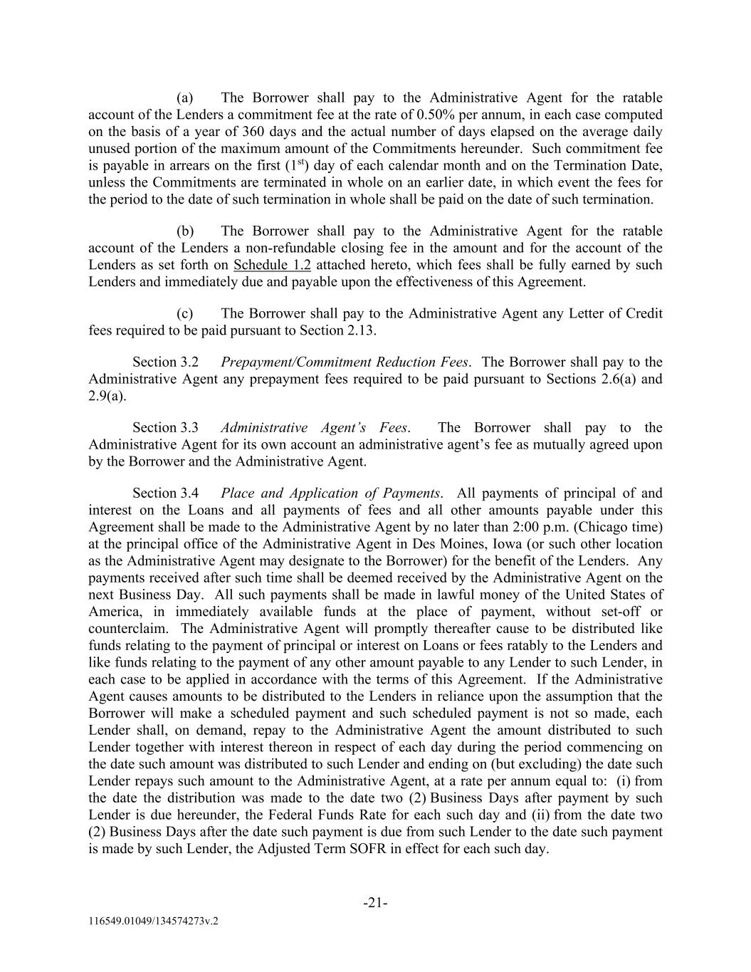 -21- 116549.01049/134574273v.2 (a) The Borrower shall pay to the Administrative Agent for the ratable account of the Lenders a commitment fee at the rate of 0.50% per annum, in each case computed on the basis of a year of 360 days and the actual number of days elapsed on the average daily unused portion of the maximum amount of the Commitments hereunder. Such commitment fee is payable in arrears on the first (1st) day of each calendar month and on the Termination Date, unless the Commitments are terminated in whole on an earlier date, in which event the fees for the period to the date of such termination in whole shall be paid on the date of such termination. (b) The Borrower shall pay to the Administrative Agent for the ratable account of the Lenders a non-refundable closing fee in the amount and for the account of the Lenders as set forth on Schedule 1.2 attached hereto, which fees shall be fully earned by such Lenders and immediately due and payable upon the effectiveness of this Agreement. (c) The Borrower shall pay to the Administrative Agent any Letter of Credit fees required to be paid pursuant to Section 2.13. Section 3.2 Prepayment/Commitment Reduction Fees. The Borrower shall pay to the Administrative Agent any prepayment fees required to be paid pursuant to Sections 2.6(a) and 2.9(a). Section 3.3 Administrative Agent’s Fees. The Borrower shall pay to the Administrative Agent for its own account an administrative agent’s fee as mutually agreed upon by the Borrower and the Administrative Agent. Section 3.4 Place and Application of Payments. All payments of principal of and interest on the Loans and all payments of fees and all other amounts payable under this Agreement shall be made to the Administrative Agent by no later than 2:00 p.m. (Chicago time) at the principal office of the Administrative Agent in Des Moines, Iowa (or such other location as the Administrative Agent may designate to the Borrower) for the benefit of the Lenders. Any payments received after such time shall be deemed received by the Administrative Agent on the next Business Day. All such payments shall be made in lawful money of the United States of America, in immediately available funds at the place of payment, without set-off or counterclaim. The Administrative Agent will promptly thereafter cause to be distributed like funds relating to the payment of principal or interest on Loans or fees ratably to the Lenders and like funds relating to the payment of any other amount payable to any Lender to such Lender, in each case to be applied in accordance with the terms of this Agreement. If the Administrative Agent causes amounts to be distributed to the Lenders in reliance upon the assumption that the Borrower will make a scheduled payment and such scheduled payment is not so made, each Lender shall, on demand, repay to the Administrative Agent the amount distributed to such Lender together with interest thereon in respect of each day during the period commencing on the date such amount was distributed to such Lender and ending on (but excluding) the date such Lender repays such amount to the Administrative Agent, at a rate per annum equal to: (i) from the date the distribution was made to the date two (2) Business Days after payment by such Lender is due hereunder, the Federal Funds Rate for each such day and (ii) from the date two (2) Business Days after the date such payment is due from such Lender to the date such payment is made by such Lender, the Adjusted Term SOFR in effect for each such day.