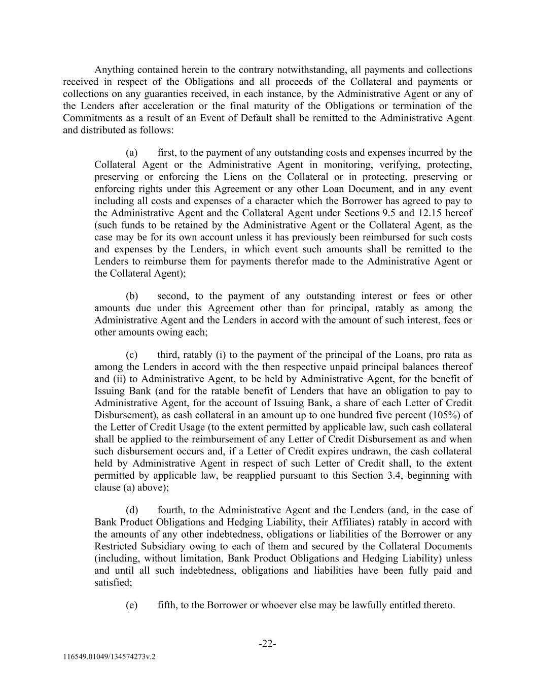 -22- 116549.01049/134574273v.2 Anything contained herein to the contrary notwithstanding, all payments and collections received in respect of the Obligations and all proceeds of the Collateral and payments or collections on any guaranties received, in each instance, by the Administrative Agent or any of the Lenders after acceleration or the final maturity of the Obligations or termination of the Commitments as a result of an Event of Default shall be remitted to the Administrative Agent and distributed as follows: (a) first, to the payment of any outstanding costs and expenses incurred by the Collateral Agent or the Administrative Agent in monitoring, verifying, protecting, preserving or enforcing the Liens on the Collateral or in protecting, preserving or enforcing rights under this Agreement or any other Loan Document, and in any event including all costs and expenses of a character which the Borrower has agreed to pay to the Administrative Agent and the Collateral Agent under Sections 9.5 and 12.15 hereof (such funds to be retained by the Administrative Agent or the Collateral Agent, as the case may be for its own account unless it has previously been reimbursed for such costs and expenses by the Lenders, in which event such amounts shall be remitted to the Lenders to reimburse them for payments therefor made to the Administrative Agent or the Collateral Agent); (b) second, to the payment of any outstanding interest or fees or other amounts due under this Agreement other than for principal, ratably as among the Administrative Agent and the Lenders in accord with the amount of such interest, fees or other amounts owing each; (c) third, ratably (i) to the payment of the principal of the Loans, pro rata as among the Lenders in accord with the then respective unpaid principal balances thereof and (ii) to Administrative Agent, to be held by Administrative Agent, for the benefit of Issuing Bank (and for the ratable benefit of Lenders that have an obligation to pay to Administrative Agent, for the account of Issuing Bank, a share of each Letter of Credit Disbursement), as cash collateral in an amount up to one hundred five percent (105%) of the Letter of Credit Usage (to the extent permitted by applicable law, such cash collateral shall be applied to the reimbursement of any Letter of Credit Disbursement as and when such disbursement occurs and, if a Letter of Credit expires undrawn, the cash collateral held by Administrative Agent in respect of such Letter of Credit shall, to the extent permitted by applicable law, be reapplied pursuant to this Section 3.4, beginning with clause (a) above); (d) fourth, to the Administrative Agent and the Lenders (and, in the case of Bank Product Obligations and Hedging Liability, their Affiliates) ratably in accord with the amounts of any other indebtedness, obligations or liabilities of the Borrower or any Restricted Subsidiary owing to each of them and secured by the Collateral Documents (including, without limitation, Bank Product Obligations and Hedging Liability) unless and until all such indebtedness, obligations and liabilities have been fully paid and satisfied; (e) fifth, to the Borrower or whoever else may be lawfully entitled thereto.