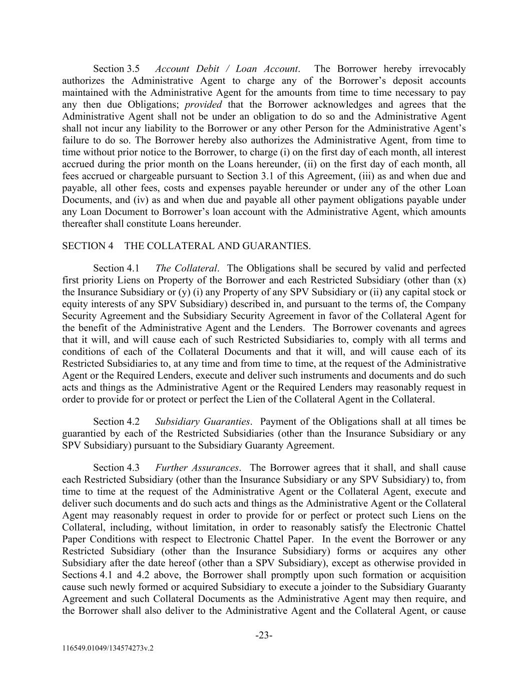 -23- 116549.01049/134574273v.2 Section 3.5 Account Debit / Loan Account. The Borrower hereby irrevocably authorizes the Administrative Agent to charge any of the Borrower’s deposit accounts maintained with the Administrative Agent for the amounts from time to time necessary to pay any then due Obligations; provided that the Borrower acknowledges and agrees that the Administrative Agent shall not be under an obligation to do so and the Administrative Agent shall not incur any liability to the Borrower or any other Person for the Administrative Agent’s failure to do so. The Borrower hereby also authorizes the Administrative Agent, from time to time without prior notice to the Borrower, to charge (i) on the first day of each month, all interest accrued during the prior month on the Loans hereunder, (ii) on the first day of each month, all fees accrued or chargeable pursuant to Section 3.1 of this Agreement, (iii) as and when due and payable, all other fees, costs and expenses payable hereunder or under any of the other Loan Documents, and (iv) as and when due and payable all other payment obligations payable under any Loan Document to Borrower’s loan account with the Administrative Agent, which amounts thereafter shall constitute Loans hereunder. SECTION 4 THE COLLATERAL AND GUARANTIES. Section 4.1 The Collateral. The Obligations shall be secured by valid and perfected first priority Liens on Property of the Borrower and each Restricted Subsidiary (other than (x) the Insurance Subsidiary or (y) (i) any Property of any SPV Subsidiary or (ii) any capital stock or equity interests of any SPV Subsidiary) described in, and pursuant to the terms of, the Company Security Agreement and the Subsidiary Security Agreement in favor of the Collateral Agent for the benefit of the Administrative Agent and the Lenders. The Borrower covenants and agrees that it will, and will cause each of such Restricted Subsidiaries to, comply with all terms and conditions of each of the Collateral Documents and that it will, and will cause each of its Restricted Subsidiaries to, at any time and from time to time, at the request of the Administrative Agent or the Required Lenders, execute and deliver such instruments and documents and do such acts and things as the Administrative Agent or the Required Lenders may reasonably request in order to provide for or protect or perfect the Lien of the Collateral Agent in the Collateral. Section 4.2 Subsidiary Guaranties. Payment of the Obligations shall at all times be guarantied by each of the Restricted Subsidiaries (other than the Insurance Subsidiary or any SPV Subsidiary) pursuant to the Subsidiary Guaranty Agreement. Section 4.3 Further Assurances. The Borrower agrees that it shall, and shall cause each Restricted Subsidiary (other than the Insurance Subsidiary or any SPV Subsidiary) to, from time to time at the request of the Administrative Agent or the Collateral Agent, execute and deliver such documents and do such acts and things as the Administrative Agent or the Collateral Agent may reasonably request in order to provide for or perfect or protect such Liens on the Collateral, including, without limitation, in order to reasonably satisfy the Electronic Chattel Paper Conditions with respect to Electronic Chattel Paper. In the event the Borrower or any Restricted Subsidiary (other than the Insurance Subsidiary) forms or acquires any other Subsidiary after the date hereof (other than a SPV Subsidiary), except as otherwise provided in Sections 4.1 and 4.2 above, the Borrower shall promptly upon such formation or acquisition cause such newly formed or acquired Subsidiary to execute a joinder to the Subsidiary Guaranty Agreement and such Collateral Documents as the Administrative Agent may then require, and the Borrower shall also deliver to the Administrative Agent and the Collateral Agent, or cause