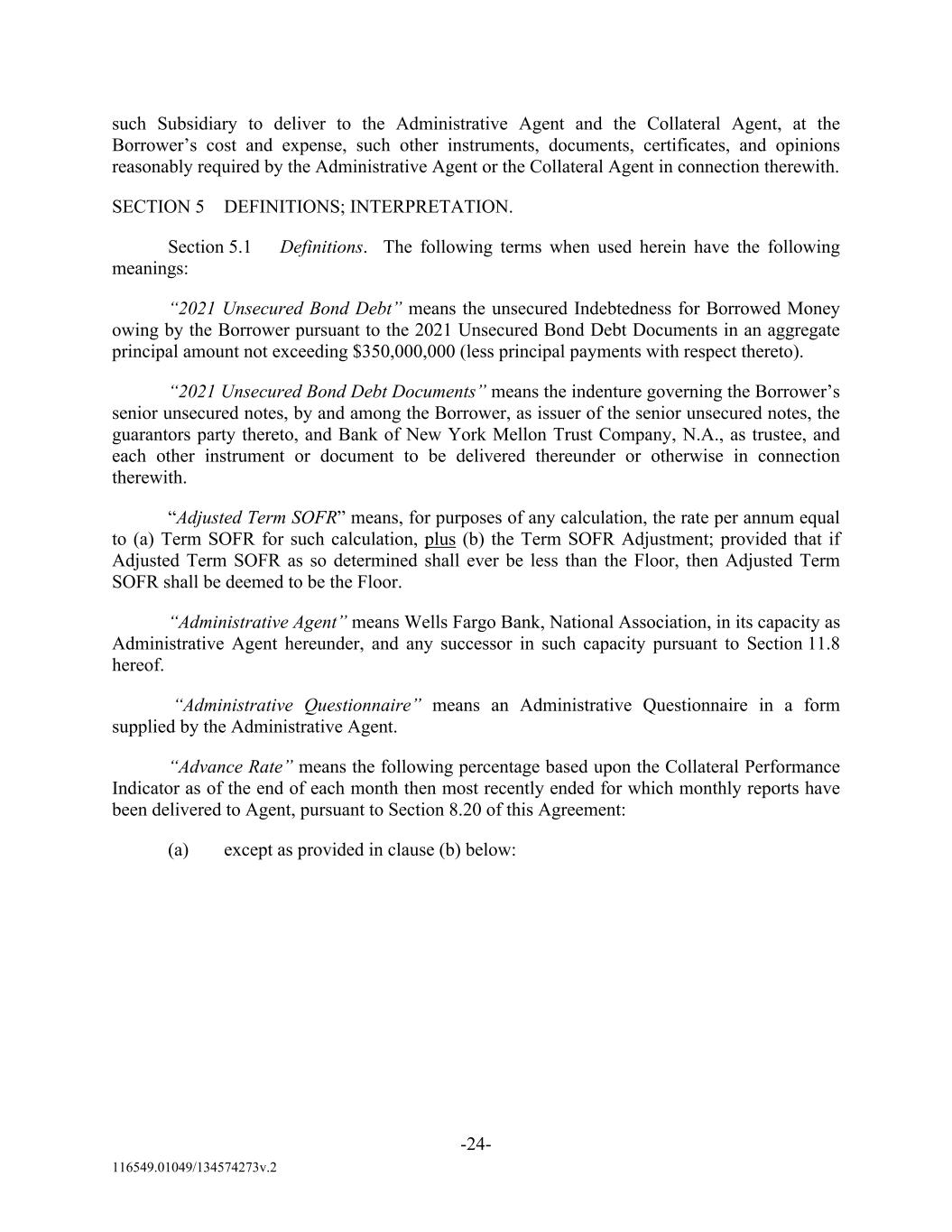 -24- 116549.01049/134574273v.2 such Subsidiary to deliver to the Administrative Agent and the Collateral Agent, at the Borrower’s cost and expense, such other instruments, documents, certificates, and opinions reasonably required by the Administrative Agent or the Collateral Agent in connection therewith. SECTION 5 DEFINITIONS; INTERPRETATION. Section 5.1 Definitions. The following terms when used herein have the following meanings: “2021 Unsecured Bond Debt” means the unsecured Indebtedness for Borrowed Money owing by the Borrower pursuant to the 2021 Unsecured Bond Debt Documents in an aggregate principal amount not exceeding $350,000,000 (less principal payments with respect thereto). “2021 Unsecured Bond Debt Documents” means the indenture governing the Borrower’s senior unsecured notes, by and among the Borrower, as issuer of the senior unsecured notes, the guarantors party thereto, and Bank of New York Mellon Trust Company, N.A., as trustee, and each other instrument or document to be delivered thereunder or otherwise in connection therewith. “Adjusted Term SOFR” means, for purposes of any calculation, the rate per annum equal to (a) Term SOFR for such calculation, plus (b) the Term SOFR Adjustment; provided that if Adjusted Term SOFR as so determined shall ever be less than the Floor, then Adjusted Term SOFR shall be deemed to be the Floor. “Administrative Agent” means Wells Fargo Bank, National Association, in its capacity as Administrative Agent hereunder, and any successor in such capacity pursuant to Section 11.8 hereof. “Administrative Questionnaire” means an Administrative Questionnaire in a form supplied by the Administrative Agent. “Advance Rate” means the following percentage based upon the Collateral Performance Indicator as of the end of each month then most recently ended for which monthly reports have been delivered to Agent, pursuant to Section 8.20 of this Agreement: (a) except as provided in clause (b) below: