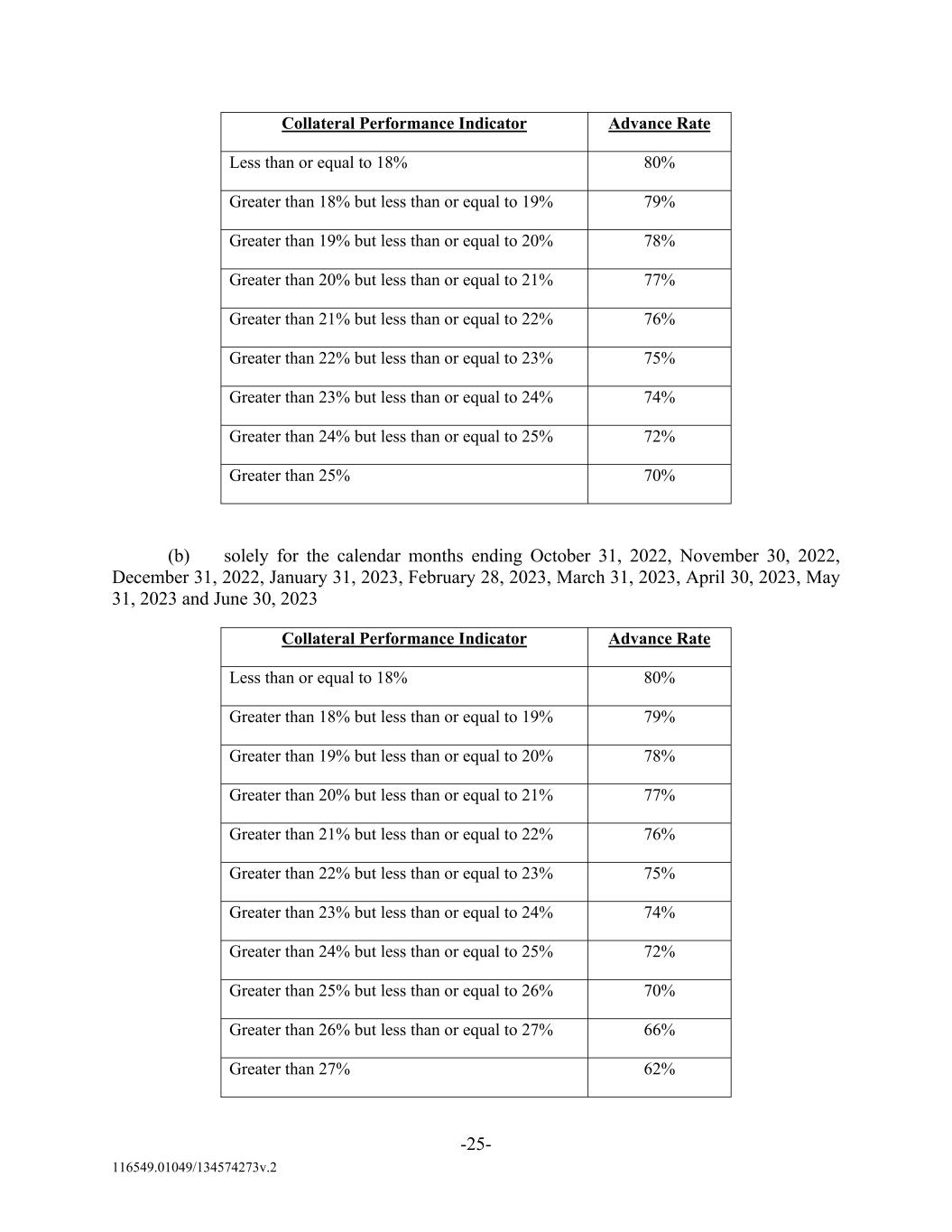 -25- 116549.01049/134574273v.2 Collateral Performance Indicator Advance Rate Less than or equal to 18% 80% Greater than 18% but less than or equal to 19% 79% Greater than 19% but less than or equal to 20% 78% Greater than 20% but less than or equal to 21% 77% Greater than 21% but less than or equal to 22% 76% Greater than 22% but less than or equal to 23% 75% Greater than 23% but less than or equal to 24% 74% Greater than 24% but less than or equal to 25% 72% Greater than 25% 70% (b) solely for the calendar months ending October 31, 2022, November 30, 2022, December 31, 2022, January 31, 2023, February 28, 2023, March 31, 2023, April 30, 2023, May 31, 2023 and June 30, 2023 Collateral Performance Indicator Advance Rate Less than or equal to 18% 80% Greater than 18% but less than or equal to 19% 79% Greater than 19% but less than or equal to 20% 78% Greater than 20% but less than or equal to 21% 77% Greater than 21% but less than or equal to 22% 76% Greater than 22% but less than or equal to 23% 75% Greater than 23% but less than or equal to 24% 74% Greater than 24% but less than or equal to 25% 72% Greater than 25% but less than or equal to 26% 70% Greater than 26% but less than or equal to 27% 66% Greater than 27% 62%