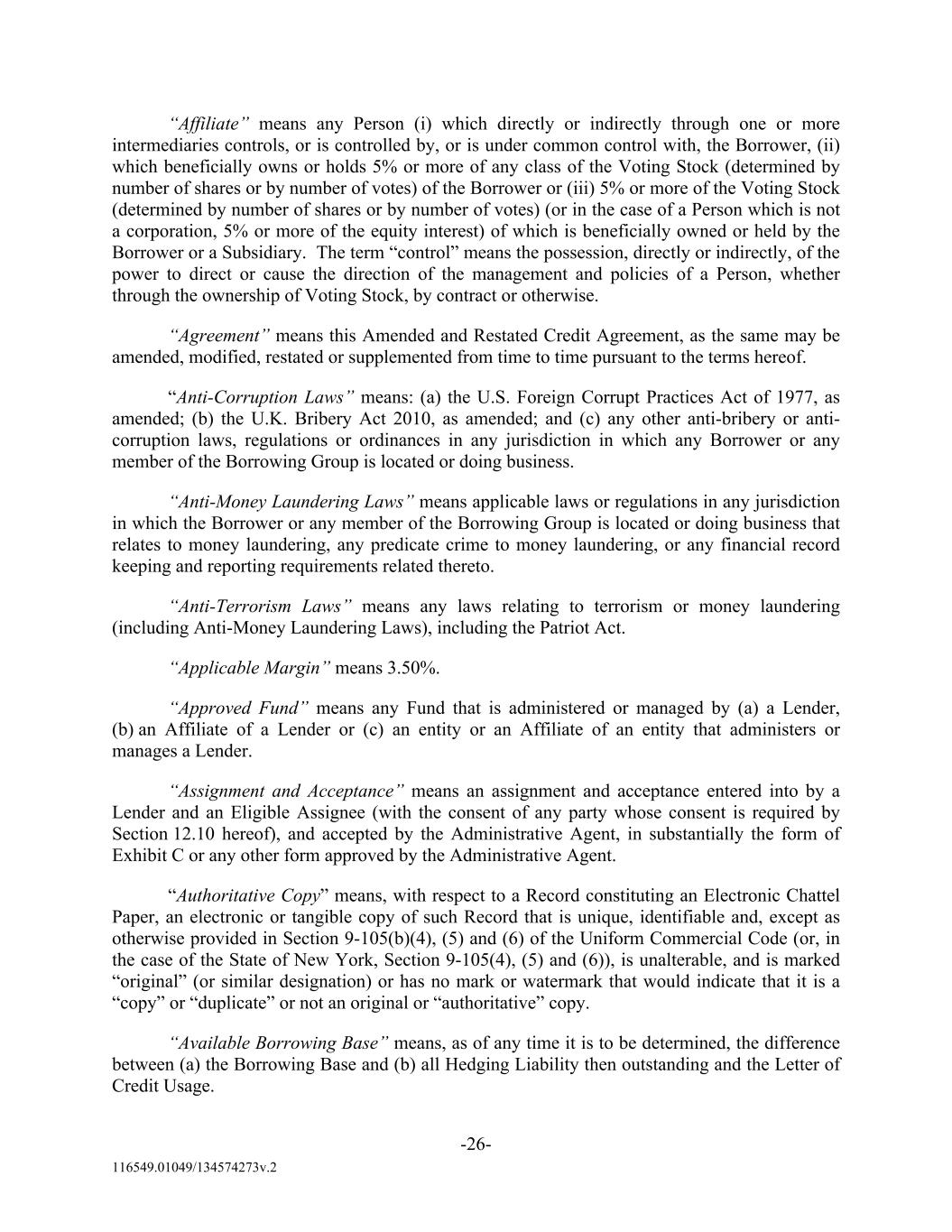 -26- 116549.01049/134574273v.2 “Affiliate” means any Person (i) which directly or indirectly through one or more intermediaries controls, or is controlled by, or is under common control with, the Borrower, (ii) which beneficially owns or holds 5% or more of any class of the Voting Stock (determined by number of shares or by number of votes) of the Borrower or (iii) 5% or more of the Voting Stock (determined by number of shares or by number of votes) (or in the case of a Person which is not a corporation, 5% or more of the equity interest) of which is beneficially owned or held by the Borrower or a Subsidiary. The term “control” means the possession, directly or indirectly, of the power to direct or cause the direction of the management and policies of a Person, whether through the ownership of Voting Stock, by contract or otherwise. “Agreement” means this Amended and Restated Credit Agreement, as the same may be amended, modified, restated or supplemented from time to time pursuant to the terms hereof. “Anti-Corruption Laws” means: (a) the U.S. Foreign Corrupt Practices Act of 1977, as amended; (b) the U.K. Bribery Act 2010, as amended; and (c) any other anti-bribery or anti- corruption laws, regulations or ordinances in any jurisdiction in which any Borrower or any member of the Borrowing Group is located or doing business. “Anti-Money Laundering Laws” means applicable laws or regulations in any jurisdiction in which the Borrower or any member of the Borrowing Group is located or doing business that relates to money laundering, any predicate crime to money laundering, or any financial record keeping and reporting requirements related thereto. “Anti-Terrorism Laws” means any laws relating to terrorism or money laundering (including Anti-Money Laundering Laws), including the Patriot Act. “Applicable Margin” means 3.50%. “Approved Fund” means any Fund that is administered or managed by (a) a Lender, (b) an Affiliate of a Lender or (c) an entity or an Affiliate of an entity that administers or manages a Lender. “Assignment and Acceptance” means an assignment and acceptance entered into by a Lender and an Eligible Assignee (with the consent of any party whose consent is required by Section 12.10 hereof), and accepted by the Administrative Agent, in substantially the form of Exhibit C or any other form approved by the Administrative Agent. “Authoritative Copy” means, with respect to a Record constituting an Electronic Chattel Paper, an electronic or tangible copy of such Record that is unique, identifiable and, except as otherwise provided in Section 9-105(b)(4), (5) and (6) of the Uniform Commercial Code (or, in the case of the State of New York, Section 9-105(4), (5) and (6)), is unalterable, and is marked “original” (or similar designation) or has no mark or watermark that would indicate that it is a “copy” or “duplicate” or not an original or “authoritative” copy. “Available Borrowing Base” means, as of any time it is to be determined, the difference between (a) the Borrowing Base and (b) all Hedging Liability then outstanding and the Letter of Credit Usage.