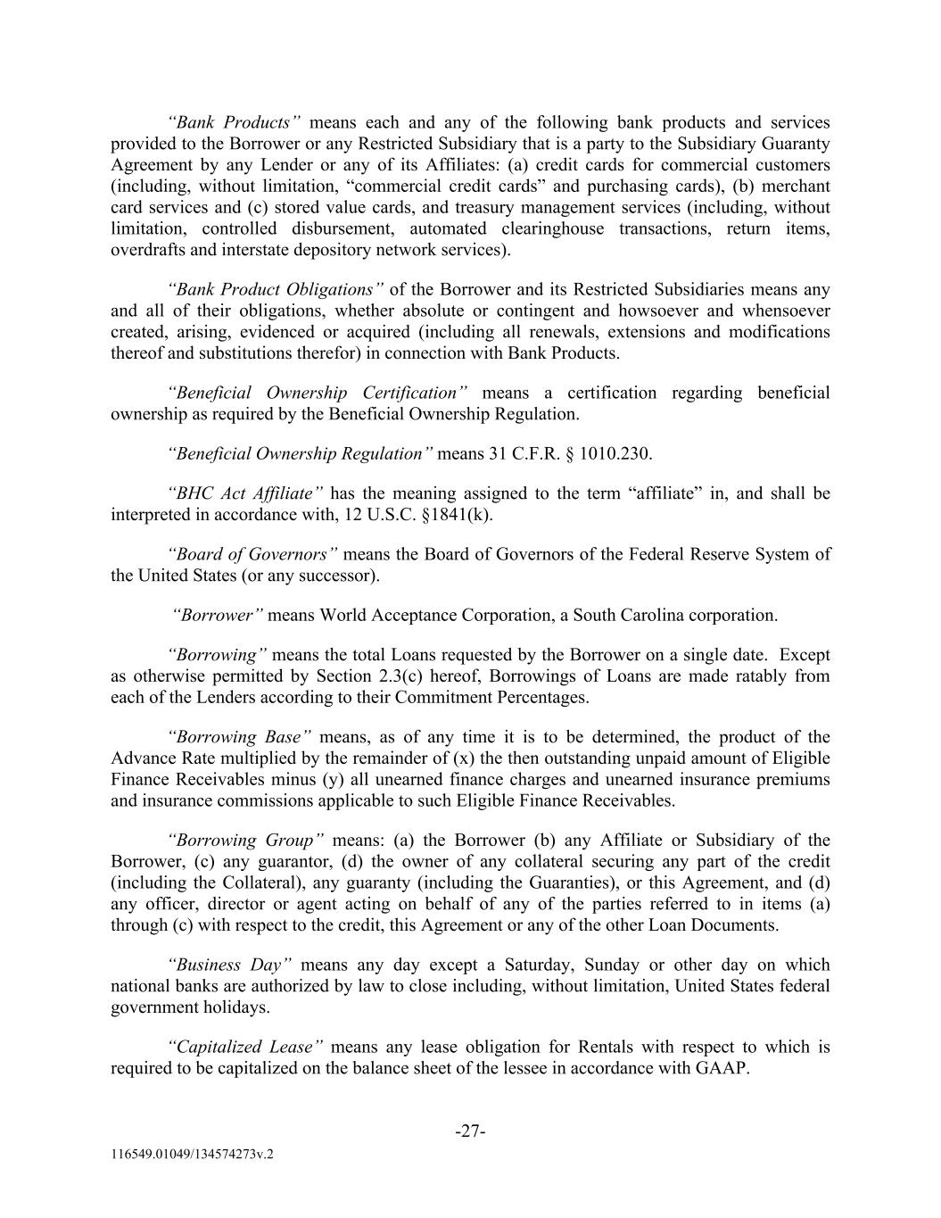 -27- 116549.01049/134574273v.2 “Bank Products” means each and any of the following bank products and services provided to the Borrower or any Restricted Subsidiary that is a party to the Subsidiary Guaranty Agreement by any Lender or any of its Affiliates: (a) credit cards for commercial customers (including, without limitation, “commercial credit cards” and purchasing cards), (b) merchant card services and (c) stored value cards, and treasury management services (including, without limitation, controlled disbursement, automated clearinghouse transactions, return items, overdrafts and interstate depository network services). “Bank Product Obligations” of the Borrower and its Restricted Subsidiaries means any and all of their obligations, whether absolute or contingent and howsoever and whensoever created, arising, evidenced or acquired (including all renewals, extensions and modifications thereof and substitutions therefor) in connection with Bank Products. “Beneficial Ownership Certification” means a certification regarding beneficial ownership as required by the Beneficial Ownership Regulation. “Beneficial Ownership Regulation” means 31 C.F.R. § 1010.230. “BHC Act Affiliate” has the meaning assigned to the term “affiliate” in, and shall be interpreted in accordance with, 12 U.S.C. §1841(k). “Board of Governors” means the Board of Governors of the Federal Reserve System of the United States (or any successor). “Borrower” means World Acceptance Corporation, a South Carolina corporation. “Borrowing” means the total Loans requested by the Borrower on a single date. Except as otherwise permitted by Section 2.3(c) hereof, Borrowings of Loans are made ratably from each of the Lenders according to their Commitment Percentages. “Borrowing Base” means, as of any time it is to be determined, the product of the Advance Rate multiplied by the remainder of (x) the then outstanding unpaid amount of Eligible Finance Receivables minus (y) all unearned finance charges and unearned insurance premiums and insurance commissions applicable to such Eligible Finance Receivables. “Borrowing Group” means: (a) the Borrower (b) any Affiliate or Subsidiary of the Borrower, (c) any guarantor, (d) the owner of any collateral securing any part of the credit (including the Collateral), any guaranty (including the Guaranties), or this Agreement, and (d) any officer, director or agent acting on behalf of any of the parties referred to in items (a) through (c) with respect to the credit, this Agreement or any of the other Loan Documents. “Business Day” means any day except a Saturday, Sunday or other day on which national banks are authorized by law to close including, without limitation, United States federal government holidays. “Capitalized Lease” means any lease obligation for Rentals with respect to which is required to be capitalized on the balance sheet of the lessee in accordance with GAAP.