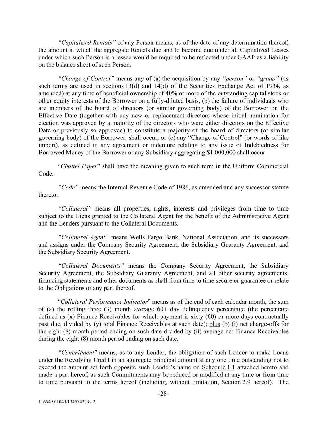 -28- 116549.01049/134574273v.2 “Capitalized Rentals” of any Person means, as of the date of any determination thereof, the amount at which the aggregate Rentals due and to become due under all Capitalized Leases under which such Person is a lessee would be required to be reflected under GAAP as a liability on the balance sheet of such Person. “Change of Control” means any of (a) the acquisition by any “person” or “group” (as such terms are used in sections 13(d) and 14(d) of the Securities Exchange Act of 1934, as amended) at any time of beneficial ownership of 40% or more of the outstanding capital stock or other equity interests of the Borrower on a fully-diluted basis, (b) the failure of individuals who are members of the board of directors (or similar governing body) of the Borrower on the Effective Date (together with any new or replacement directors whose initial nomination for election was approved by a majority of the directors who were either directors on the Effective Date or previously so approved) to constitute a majority of the board of directors (or similar governing body) of the Borrower, shall occur, or (c) any “Change of Control” (or words of like import), as defined in any agreement or indenture relating to any issue of Indebtedness for Borrowed Money of the Borrower or any Subsidiary aggregating $1,000,000 shall occur. “Chattel Paper” shall have the meaning given to such term in the Uniform Commercial Code. “Code” means the Internal Revenue Code of 1986, as amended and any successor statute thereto. “Collateral” means all properties, rights, interests and privileges from time to time subject to the Liens granted to the Collateral Agent for the benefit of the Administrative Agent and the Lenders pursuant to the Collateral Documents. “Collateral Agent” means Wells Fargo Bank, National Association, and its successors and assigns under the Company Security Agreement, the Subsidiary Guaranty Agreement, and the Subsidiary Security Agreement. “Collateral Documents” means the Company Security Agreement, the Subsidiary Security Agreement, the Subsidiary Guaranty Agreement, and all other security agreements, financing statements and other documents as shall from time to time secure or guarantee or relate to the Obligations or any part thereof. “Collateral Performance Indicator” means as of the end of each calendar month, the sum of (a) the rolling three (3) month average 60+ day delinquency percentage (the percentage defined as (x) Finance Receivables for which payment is sixty (60) or more days contractually past due, divided by (y) total Finance Receivables at such date); plus (b) (i) net charge-offs for the eight (8) month period ending on such date divided by (ii) average net Finance Receivables during the eight (8) month period ending on such date. “Commitment" means, as to any Lender, the obligation of such Lender to make Loans under the Revolving Credit in an aggregate principal amount at any one time outstanding not to exceed the amount set forth opposite such Lender’s name on Schedule 1.1 attached hereto and made a part hereof, as such Commitments may be reduced or modified at any time or from time to time pursuant to the terms hereof (including, without limitation, Section 2.9 hereof). The