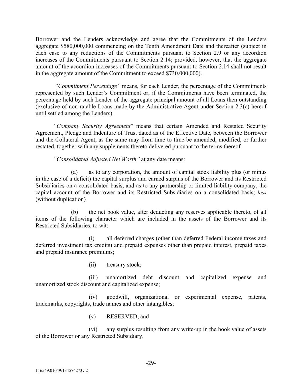 -29- 116549.01049/134574273v.2 Borrower and the Lenders acknowledge and agree that the Commitments of the Lenders aggregate $580,000,000 commencing on the Tenth Amendment Date and thereafter (subject in each case to any reductions of the Commitments pursuant to Section 2.9 or any accordion increases of the Commitments pursuant to Section 2.14; provided, however, that the aggregate amount of the accordion increases of the Commitments pursuant to Section 2.14 shall not result in the aggregate amount of the Commitment to exceed $730,000,000). “Commitment Percentage” means, for each Lender, the percentage of the Commitments represented by such Lender’s Commitment or, if the Commitments have been terminated, the percentage held by such Lender of the aggregate principal amount of all Loans then outstanding (exclusive of non-ratable Loans made by the Administrative Agent under Section 2.3(c) hereof until settled among the Lenders). “Company Security Agreement” means that certain Amended and Restated Security Agreement, Pledge and Indenture of Trust dated as of the Effective Date, between the Borrower and the Collateral Agent, as the same may from time to time be amended, modified, or further restated, together with any supplements thereto delivered pursuant to the terms thereof. “Consolidated Adjusted Net Worth” at any date means: (a) as to any corporation, the amount of capital stock liability plus (or minus in the case of a deficit) the capital surplus and earned surplus of the Borrower and its Restricted Subsidiaries on a consolidated basis, and as to any partnership or limited liability company, the capital account of the Borrower and its Restricted Subsidiaries on a consolidated basis; less (without duplication) (b) the net book value, after deducting any reserves applicable thereto, of all items of the following character which are included in the assets of the Borrower and its Restricted Subsidiaries, to wit: (i) all deferred charges (other than deferred Federal income taxes and deferred investment tax credits) and prepaid expenses other than prepaid interest, prepaid taxes and prepaid insurance premiums; (ii) treasury stock; (iii) unamortized debt discount and capitalized expense and unamortized stock discount and capitalized expense; (iv) goodwill, organizational or experimental expense, patents, trademarks, copyrights, trade names and other intangibles; (v) RESERVED; and (vi) any surplus resulting from any write-up in the book value of assets of the Borrower or any Restricted Subsidiary.