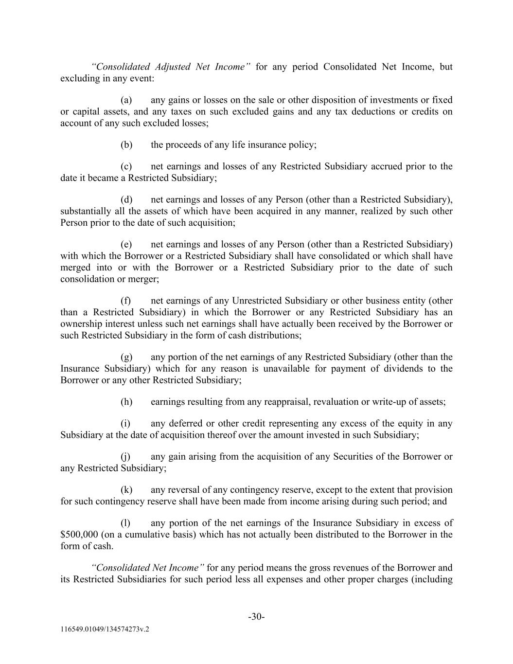 -30- 116549.01049/134574273v.2 “Consolidated Adjusted Net Income” for any period Consolidated Net Income, but excluding in any event: (a) any gains or losses on the sale or other disposition of investments or fixed or capital assets, and any taxes on such excluded gains and any tax deductions or credits on account of any such excluded losses; (b) the proceeds of any life insurance policy; (c) net earnings and losses of any Restricted Subsidiary accrued prior to the date it became a Restricted Subsidiary; (d) net earnings and losses of any Person (other than a Restricted Subsidiary), substantially all the assets of which have been acquired in any manner, realized by such other Person prior to the date of such acquisition; (e) net earnings and losses of any Person (other than a Restricted Subsidiary) with which the Borrower or a Restricted Subsidiary shall have consolidated or which shall have merged into or with the Borrower or a Restricted Subsidiary prior to the date of such consolidation or merger; (f) net earnings of any Unrestricted Subsidiary or other business entity (other than a Restricted Subsidiary) in which the Borrower or any Restricted Subsidiary has an ownership interest unless such net earnings shall have actually been received by the Borrower or such Restricted Subsidiary in the form of cash distributions; (g) any portion of the net earnings of any Restricted Subsidiary (other than the Insurance Subsidiary) which for any reason is unavailable for payment of dividends to the Borrower or any other Restricted Subsidiary; (h) earnings resulting from any reappraisal, revaluation or write-up of assets; (i) any deferred or other credit representing any excess of the equity in any Subsidiary at the date of acquisition thereof over the amount invested in such Subsidiary; (j) any gain arising from the acquisition of any Securities of the Borrower or any Restricted Subsidiary; (k) any reversal of any contingency reserve, except to the extent that provision for such contingency reserve shall have been made from income arising during such period; and (l) any portion of the net earnings of the Insurance Subsidiary in excess of $500,000 (on a cumulative basis) which has not actually been distributed to the Borrower in the form of cash. “Consolidated Net Income” for any period means the gross revenues of the Borrower and its Restricted Subsidiaries for such period less all expenses and other proper charges (including