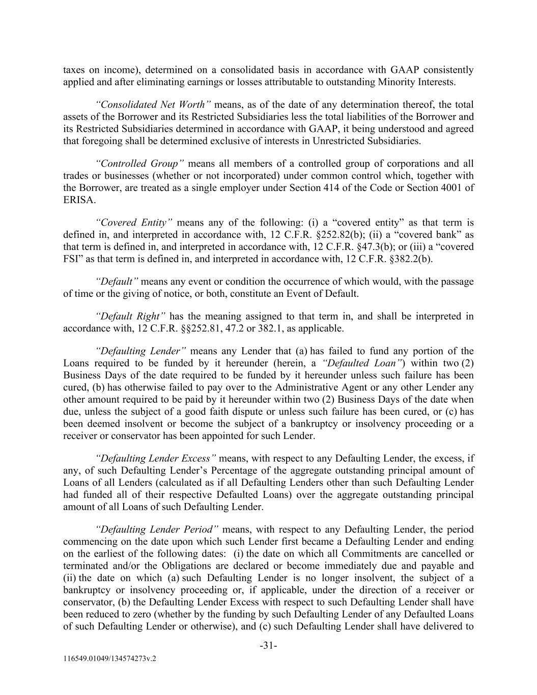 -31- 116549.01049/134574273v.2 taxes on income), determined on a consolidated basis in accordance with GAAP consistently applied and after eliminating earnings or losses attributable to outstanding Minority Interests. “Consolidated Net Worth” means, as of the date of any determination thereof, the total assets of the Borrower and its Restricted Subsidiaries less the total liabilities of the Borrower and its Restricted Subsidiaries determined in accordance with GAAP, it being understood and agreed that foregoing shall be determined exclusive of interests in Unrestricted Subsidiaries. “Controlled Group” means all members of a controlled group of corporations and all trades or businesses (whether or not incorporated) under common control which, together with the Borrower, are treated as a single employer under Section 414 of the Code or Section 4001 of ERISA. “Covered Entity” means any of the following: (i) a “covered entity” as that term is defined in, and interpreted in accordance with, 12 C.F.R. §252.82(b); (ii) a “covered bank” as that term is defined in, and interpreted in accordance with, 12 C.F.R. §47.3(b); or (iii) a “covered FSI” as that term is defined in, and interpreted in accordance with, 12 C.F.R. §382.2(b). “Default” means any event or condition the occurrence of which would, with the passage of time or the giving of notice, or both, constitute an Event of Default. “Default Right” has the meaning assigned to that term in, and shall be interpreted in accordance with, 12 C.F.R. §§252.81, 47.2 or 382.1, as applicable. “Defaulting Lender” means any Lender that (a) has failed to fund any portion of the Loans required to be funded by it hereunder (herein, a “Defaulted Loan”) within two (2) Business Days of the date required to be funded by it hereunder unless such failure has been cured, (b) has otherwise failed to pay over to the Administrative Agent or any other Lender any other amount required to be paid by it hereunder within two (2) Business Days of the date when due, unless the subject of a good faith dispute or unless such failure has been cured, or (c) has been deemed insolvent or become the subject of a bankruptcy or insolvency proceeding or a receiver or conservator has been appointed for such Lender. “Defaulting Lender Excess” means, with respect to any Defaulting Lender, the excess, if any, of such Defaulting Lender’s Percentage of the aggregate outstanding principal amount of Loans of all Lenders (calculated as if all Defaulting Lenders other than such Defaulting Lender had funded all of their respective Defaulted Loans) over the aggregate outstanding principal amount of all Loans of such Defaulting Lender. “Defaulting Lender Period” means, with respect to any Defaulting Lender, the period commencing on the date upon which such Lender first became a Defaulting Lender and ending on the earliest of the following dates: (i) the date on which all Commitments are cancelled or terminated and/or the Obligations are declared or become immediately due and payable and (ii) the date on which (a) such Defaulting Lender is no longer insolvent, the subject of a bankruptcy or insolvency proceeding or, if applicable, under the direction of a receiver or conservator, (b) the Defaulting Lender Excess with respect to such Defaulting Lender shall have been reduced to zero (whether by the funding by such Defaulting Lender of any Defaulted Loans of such Defaulting Lender or otherwise), and (c) such Defaulting Lender shall have delivered to